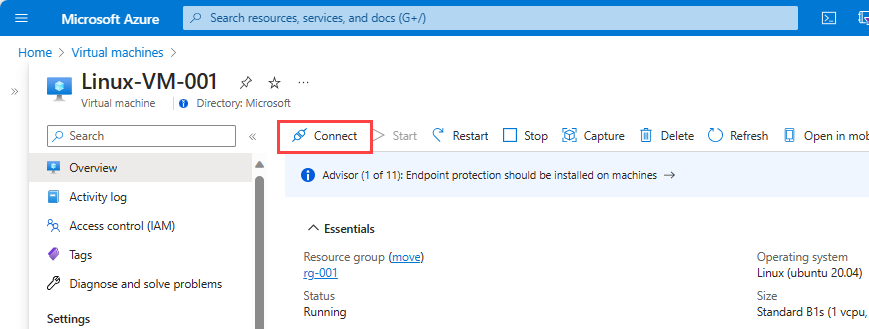 Creare una connessione SSH alla macchina virtuale in cui si vuole installare Telegraph. Selezionare il pulsante Connetti nella pagina di panoramica per la macchina virtuale.