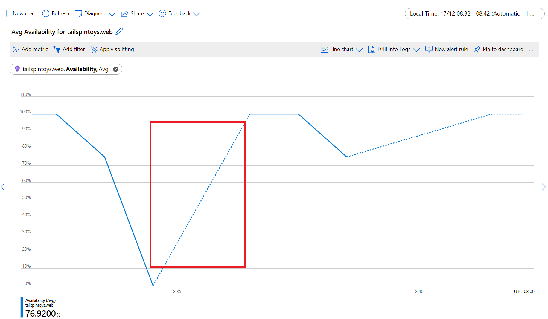 In molti casi, il calo percepito nei valori delle metriche deriva da un'errata interpretazione dei dati visualizzati nel grafico. È possibile essere indotti in errore da una diminuzione nelle somme o nei conteggi quando nel grafico vengono visualizzati i minuti più recenti perché Azure non ha ancora ricevuto o elaborato gli ultimi punti dati delle metriche. A seconda del servizio, la latenza delle metriche di elaborazione può essere compresa in un intervallo di due minuti. Per i grafici che mostrano un intervallo di tempo recente con una granularità di 1 o 5 minuti, diventa più evidente un calo del valore in base agli ultimi minuti: