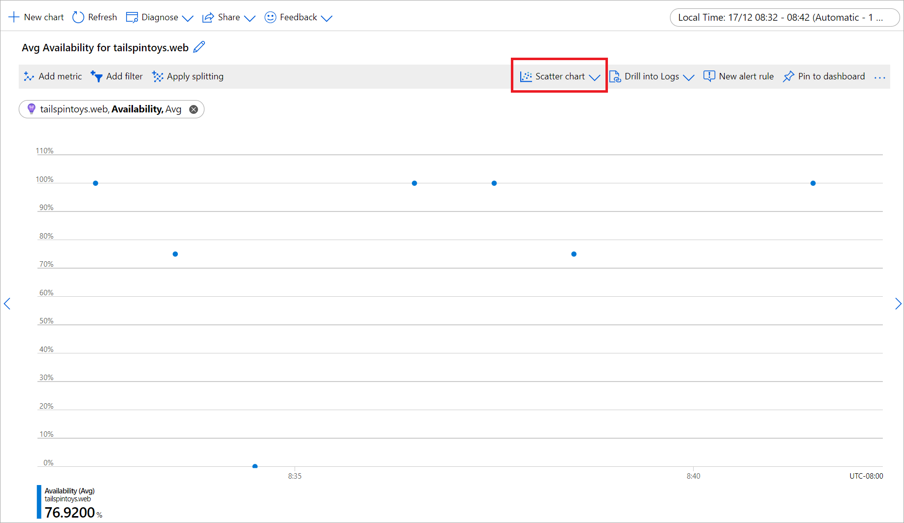 Soluzione: questo è un comportamento previsto dalla progettazione. È utile per identificare i punti dati mancanti. Il grafico a linee è una scelta eccellente per la visualizzazione delle tendenze di metriche ad alta densità, ma potrebbe essere difficile interpretare le metriche con valori sparsi, in particolare per la correlazione tra valori in cui l'intervallo di tempo è importante. La linea tratteggiata rende più facile la lettura di questi grafici. Tuttavia, se il grafico è ancora poco chiaro, valutare l'uso di un tipo di grafico diverso per visualizzare le metriche. Ad esempio, un grafico plot frammentario per la stessa metrica mostra chiaramente ogni intervallo di tempo visualizzando un punto solo quando è previsto un valore e ignorando completamente il punto dati quando non è presente alcun valore: