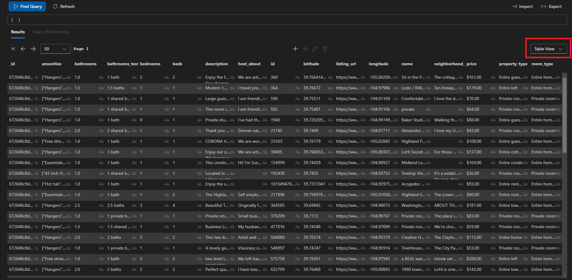 Eseguire la query fornita nell'editor di query per visualizzare i dati in Visualizzazione tabella: