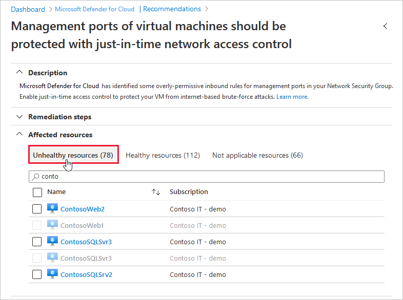 Quando Defender per il cloud trova un computer che può trarre vantaggio dall'accesso just-in-time, tale computer viene aggiunto alla scheda Risorse non integre della raccomandazione.