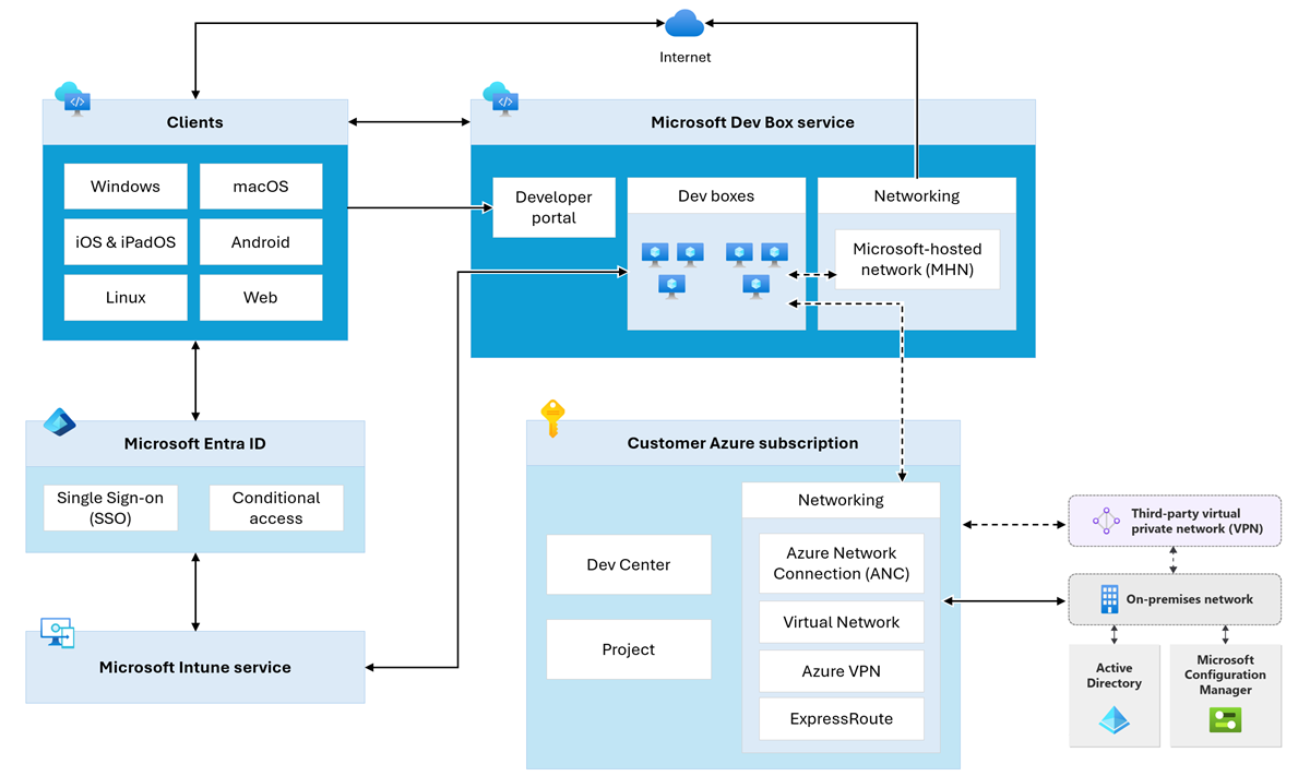 Microsoft Dev Box utilizza Microsoft Entra ID e, facoltativamente, Active Directory Domain Services (AD DS) in locale. Microsoft Entra ID fornisce: