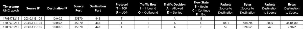 - Ogni record di log contiene l'interfaccia di rete (NIC) a cui si applica il flusso, informazioni a 5 tuple, la decisione di traffico e (solo per la versione 2) informazioni sulla velocità effettiva.