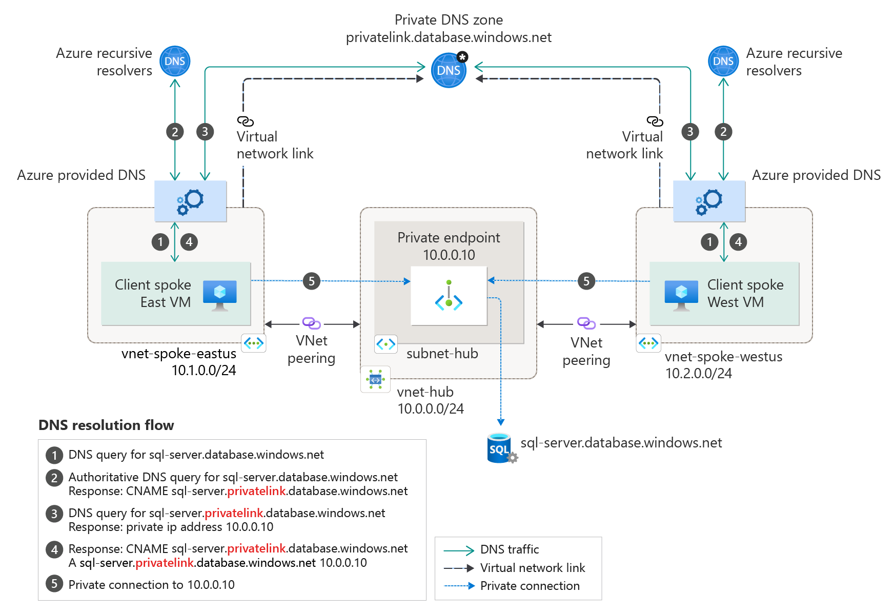 Per questa configurazione è necessaria un zona DNS privato singola. Tutte le connessioni client effettuate da reti virtuali locali e con peering devono usare anche la stessa zona DNS privata.