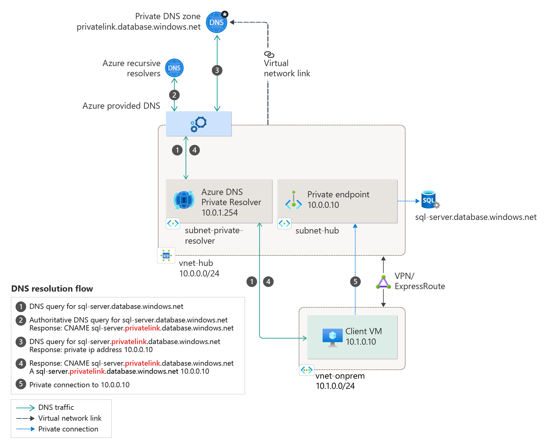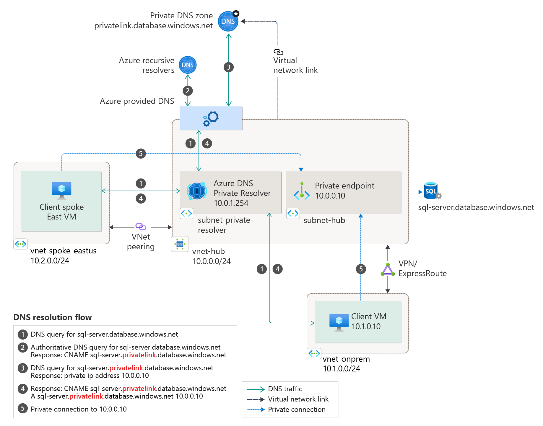 Il diagramma seguente mostra la risoluzione DNS per entrambe le reti, locale e virtuale. La risoluzione usa il Resolver privato di Azure.