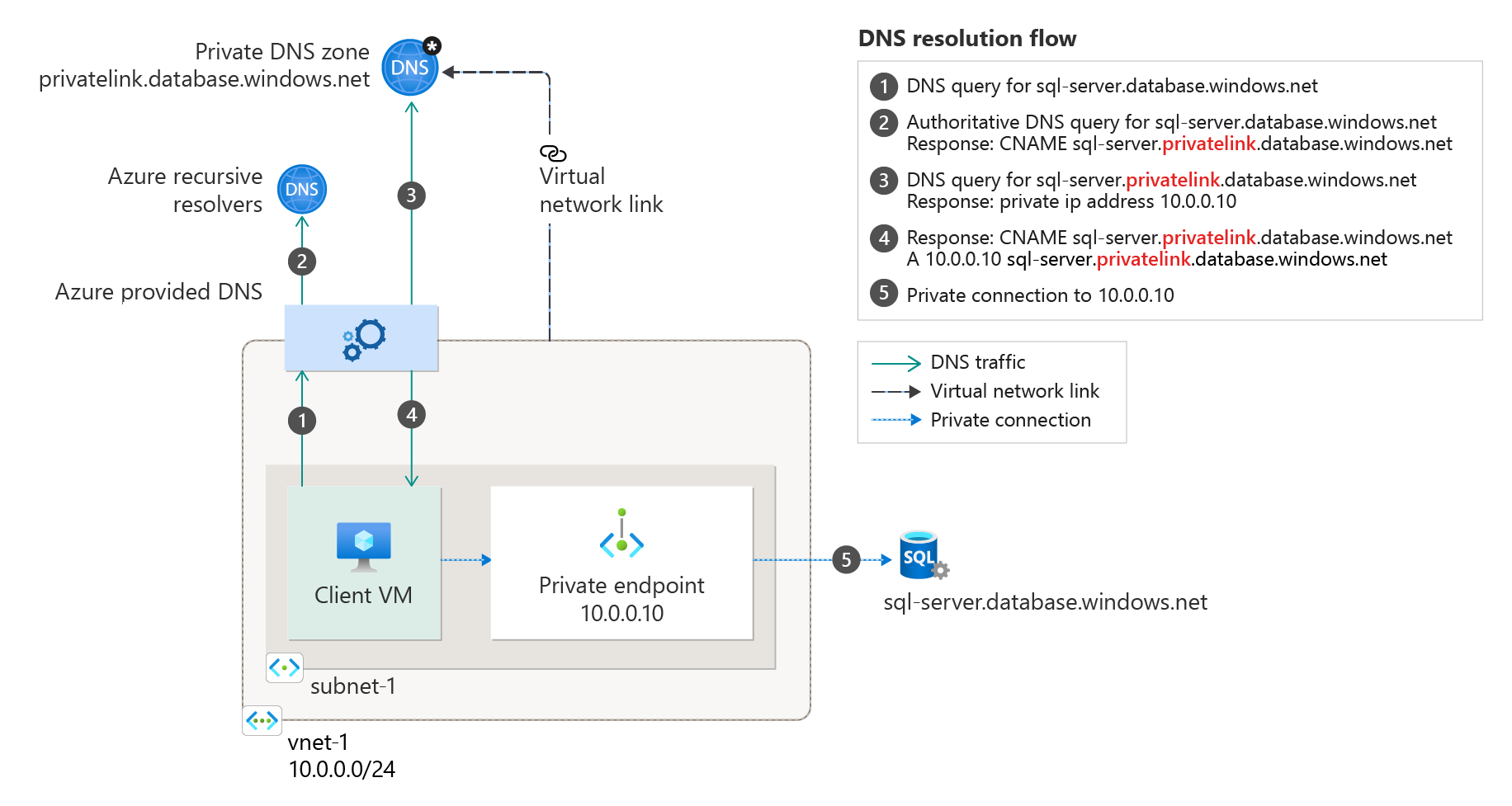 Le query DNS per gli endpoint privati devono provenire dalla rete virtuale collegata alla zona DNS privata. Il server di inoltro DNS consente di eseguire il proxy delle query per conto dei client locali. Questo scenario usa la zona DNS privato consigliata del Database SQL di Azure. Per altri servizi è possibile modificare il modello usando il seguente riferimento: configurazione della zona DNS dei servizi di Azure.