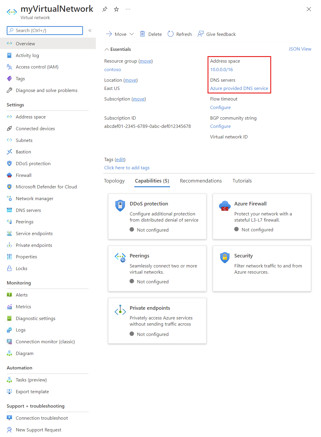 Proprietà: visualizza le impostazioni della rete virtuale, inclusi l'ID risorsa della rete virtuale e la sottoscrizione di Azure.
