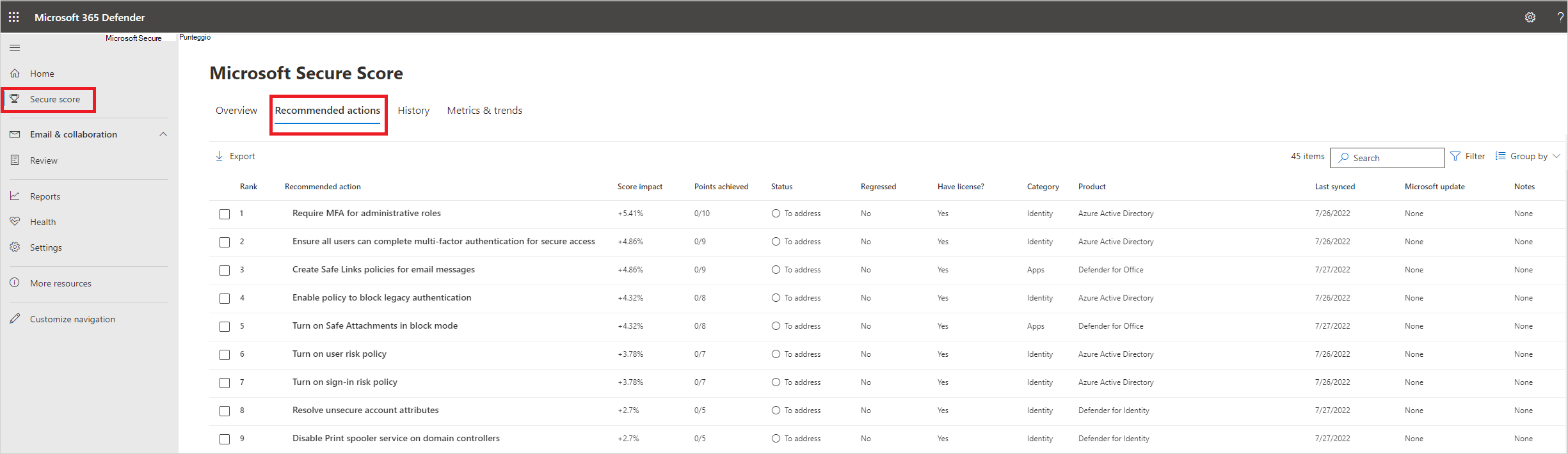 Microsoft Secure Score è una misura del comportamento di sicurezza di un'organizzazione, con un numero più elevato che indica le azioni consigliate. È disponibile https://security.microsoft.com/securescore nel portale di Microsoft Defender.