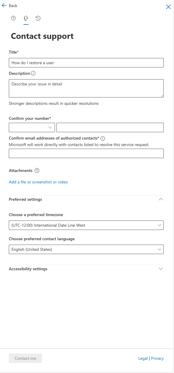 Selezionare il fuso orario e una lingua alternativa, se applicabile. La richiesta viene inviata a supporto tecnico Microsoft Team.