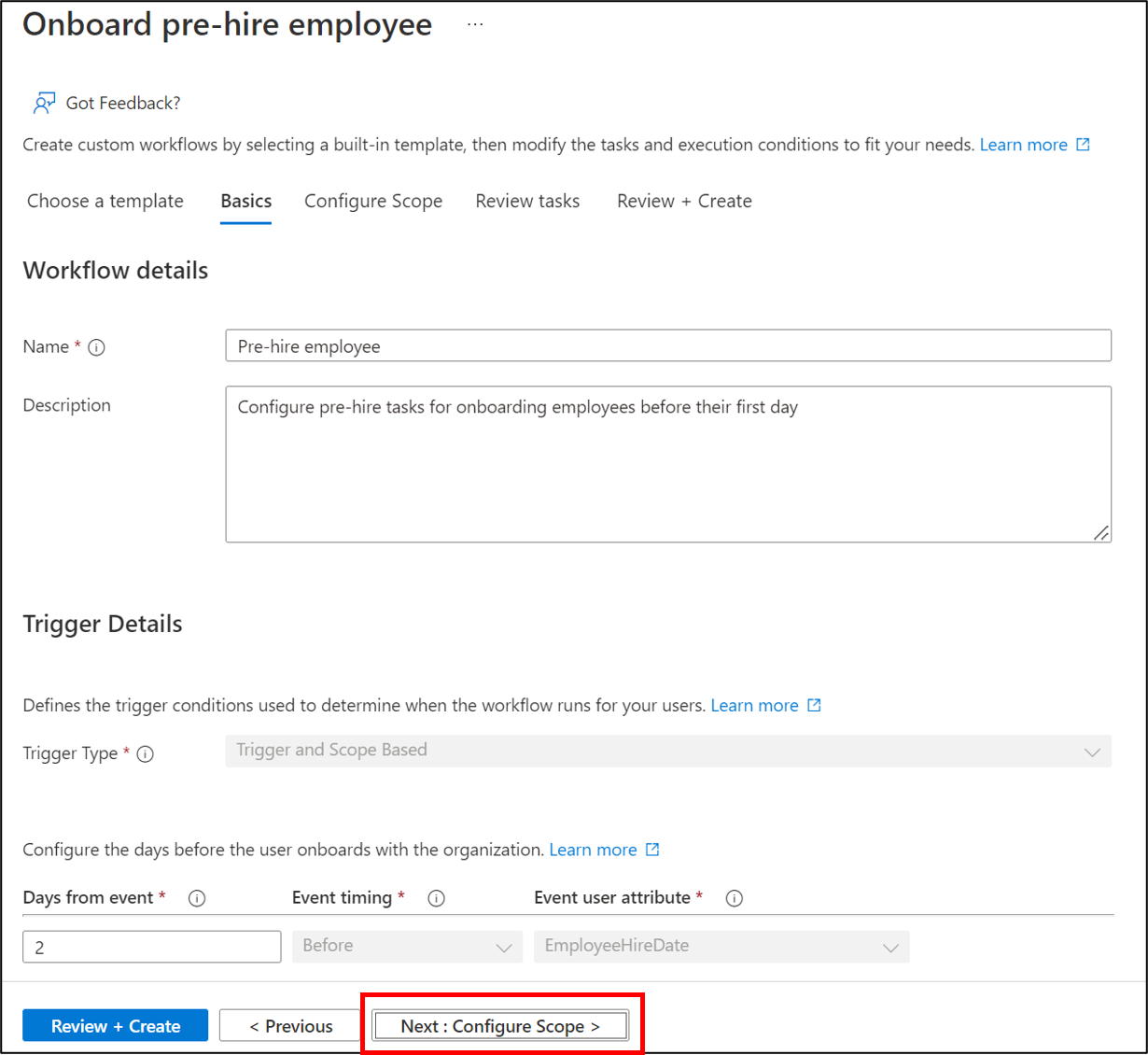 Successivamente, si configurano le informazioni di base sul flusso di lavoro che include quando il flusso di lavoro viene attivato, noto come Days from event. In questo caso, il flusso di lavoro si attiva due giorni prima della data di assunzione del dipendente. Nella schermata di onboarding dei dipendenti pre-assunzione, aggiungere le impostazioni seguenti e quindi selezionare Avanti: Configura Ambito.
