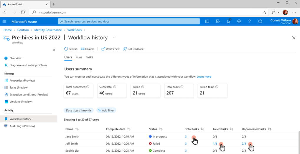 Per iniziare, selezionare la scheda Cronologia flusso di lavoro per visualizzare il riepilogo utente e le attività e gli stati del flusso di lavoro associati.