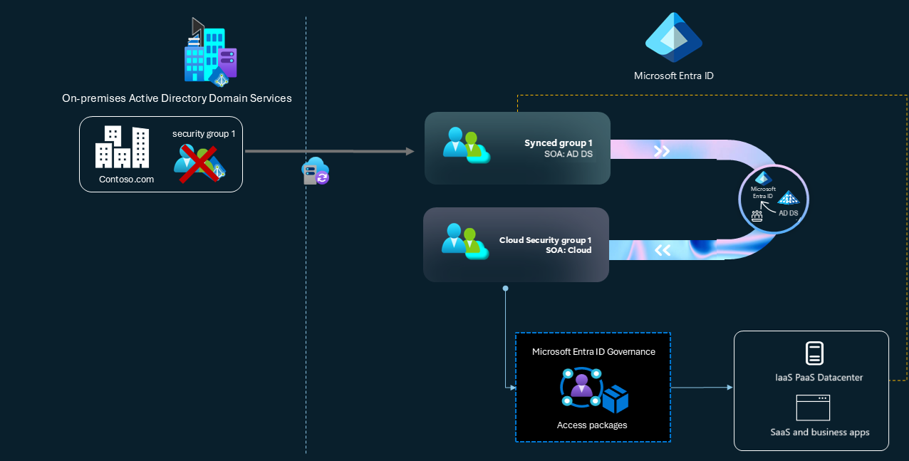 La funzionalità SOA di gruppo consente alle organizzazioni di spostare la governance dell'accesso alle applicazioni locali nel cloud. Questa funzionalità converte l'origine di autorità dei gruppi nei Servizi di dominio Active Directory (AD DS) che si sincronizzano con Microsoft Entra ID utilizzando Microsoft Entra Connect Sync o Microsoft Entra Cloud Sync. Con un approccio di migrazione in più fasi, gli amministratori possono eseguire attività di migrazione complesse riducendo al minimo le interruzioni per gli utenti finali.