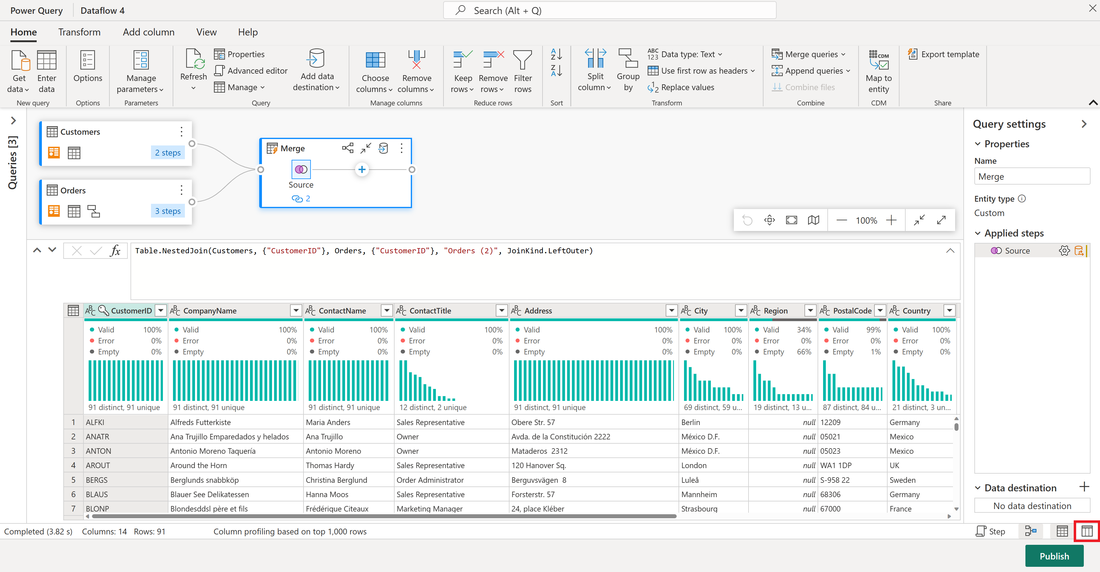 È ora disponibile una nuova query con tutte le colonne della tabella Customers e una colonna con dati annidati dalla tabella Orders.