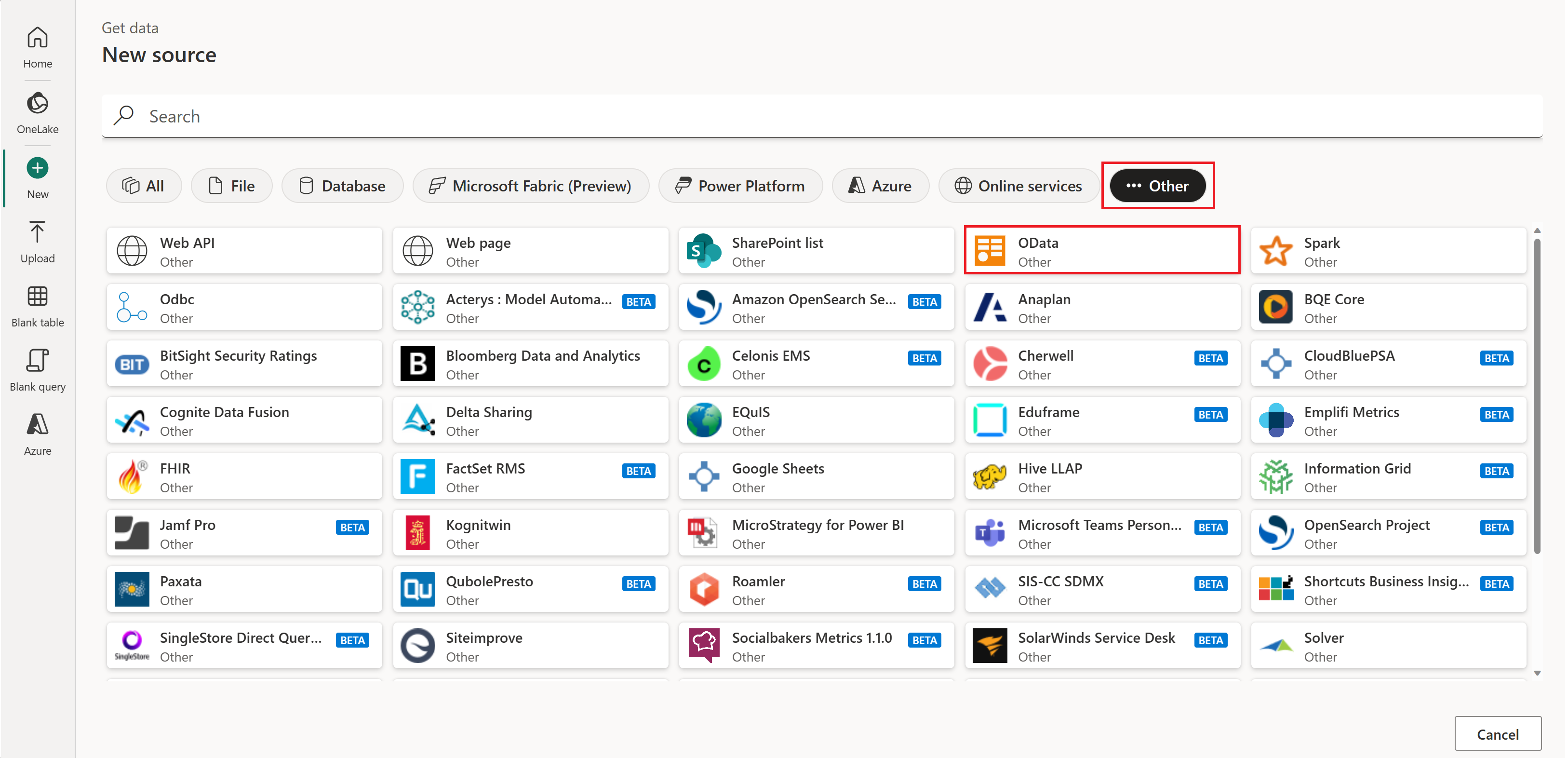In Nuova origine selezionare Altro>OData come origine dati.