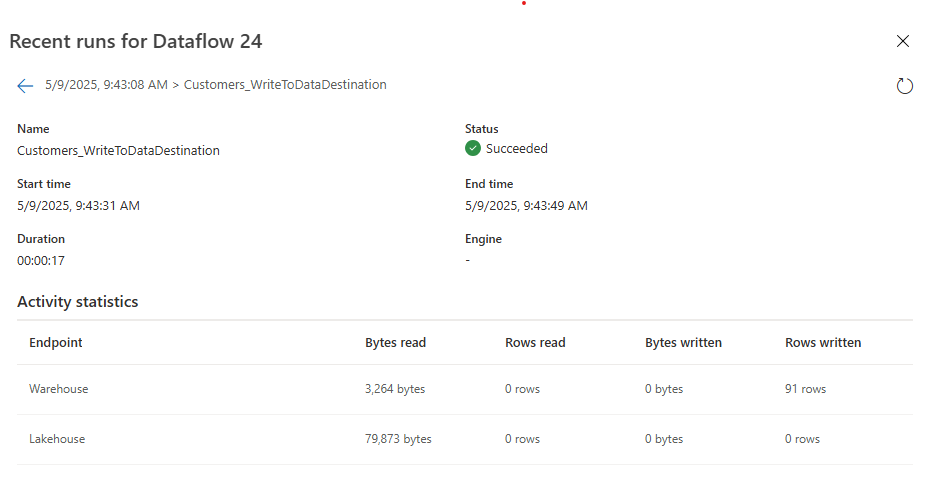 La sezione Attività riflette tutte le azioni eseguite durante l'aggiornamento, ad esempio il caricamento dei dati nella destinazione di output. Questa tabella consente anche di approfondire i dettagli dell'attività specifica. Se si seleziona il nome dell'attività, si arriva alla schermata Dettagli seguente: