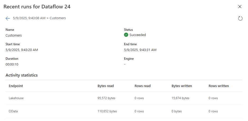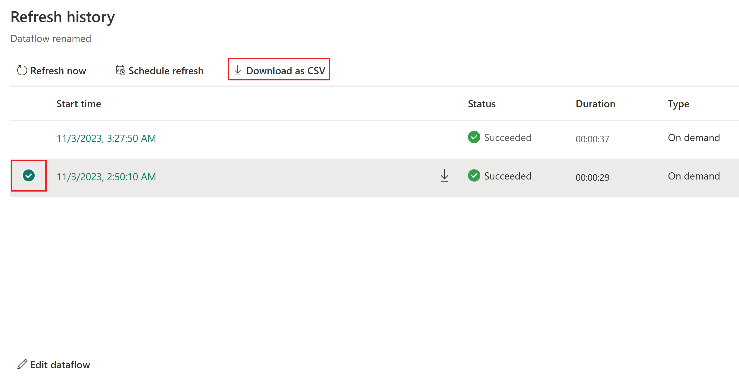 Vengono mostrate fino a 50 cronologie degli aggiornamenti o fino a un massimo di 6 mesi prima (a seconda di quale si verifica per primo) e vengono archiviate fino a 250 cronologie degli aggiornamenti o fino a 6 mesi prima in OneLake. È possibile eseguire alcune azioni direttamente da questa pagina, ad esempio avviare un nuovo aggiornamento, pianificare un aggiornamento o modificare il flusso di dati.