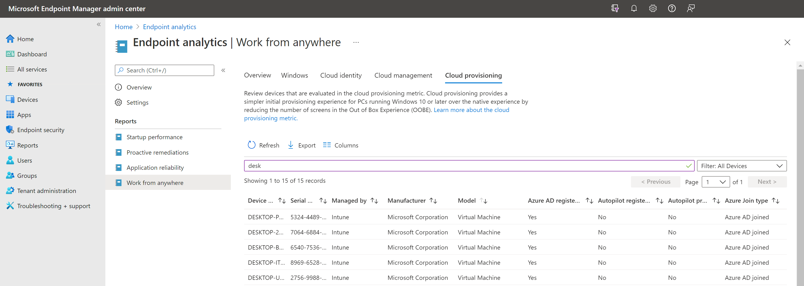 Il provisioning cloud offre un'esperienza di provisioning iniziale più semplice per i PC Windows rispetto all'esperienza nativa. Riduce il numero di schermate nella Configurazione guidata e fornisce le impostazioni predefinite, per garantire che il dispositivo stia eseguendo correttamente il provisioning dalla factory o alla reimpostazione. La metrica di provisioning cloud misura la percentuale di computer Windows 365 i PC cloud o i dispositivi Windows Intune registrati e con un profilo di distribuzione creato per Windows Autopilot.