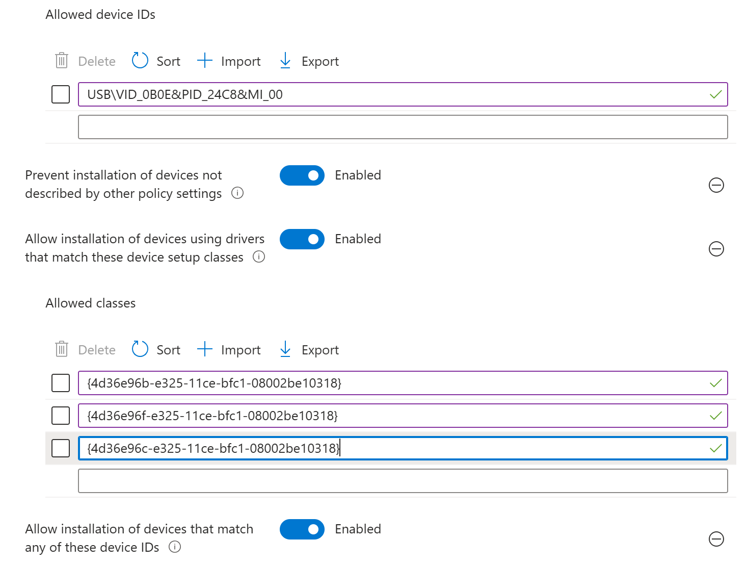 Nel profilo di configurazione del dispositivo passare all'impostazione Consenti l'installazione dei dispositivi usando driver che corrispondono a queste classi di configurazione del dispositivo e aggiungere il GUID della classe dal file di log.