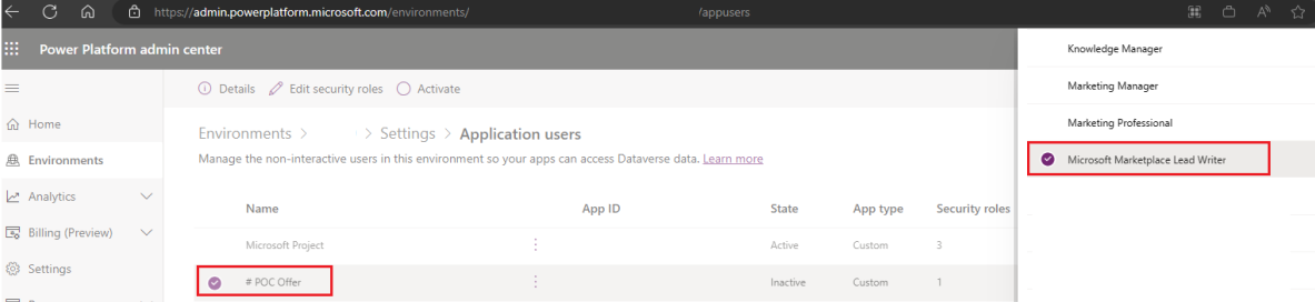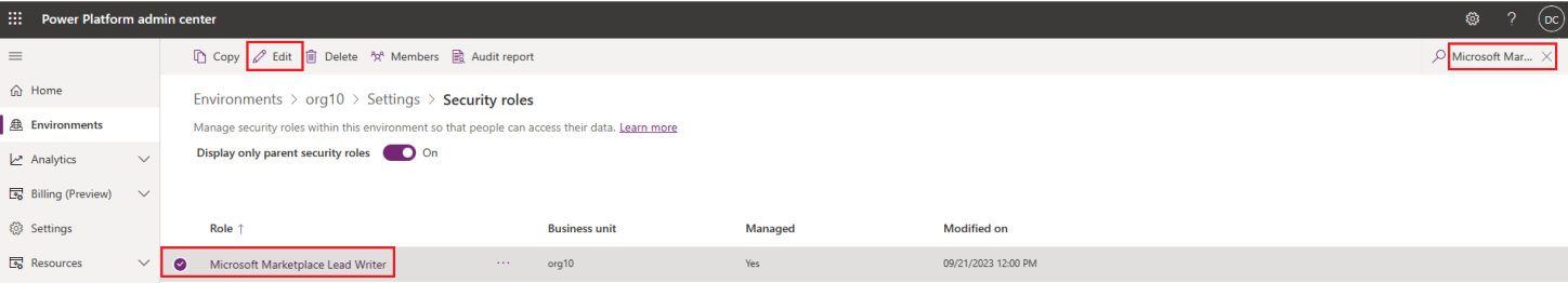 Torna a Utenti e autorizzazioni, quindi seleziona Ruoli di sicurezza. Cerca il ruolo di Microsoft Marketplace Lead Writere selezionalo.