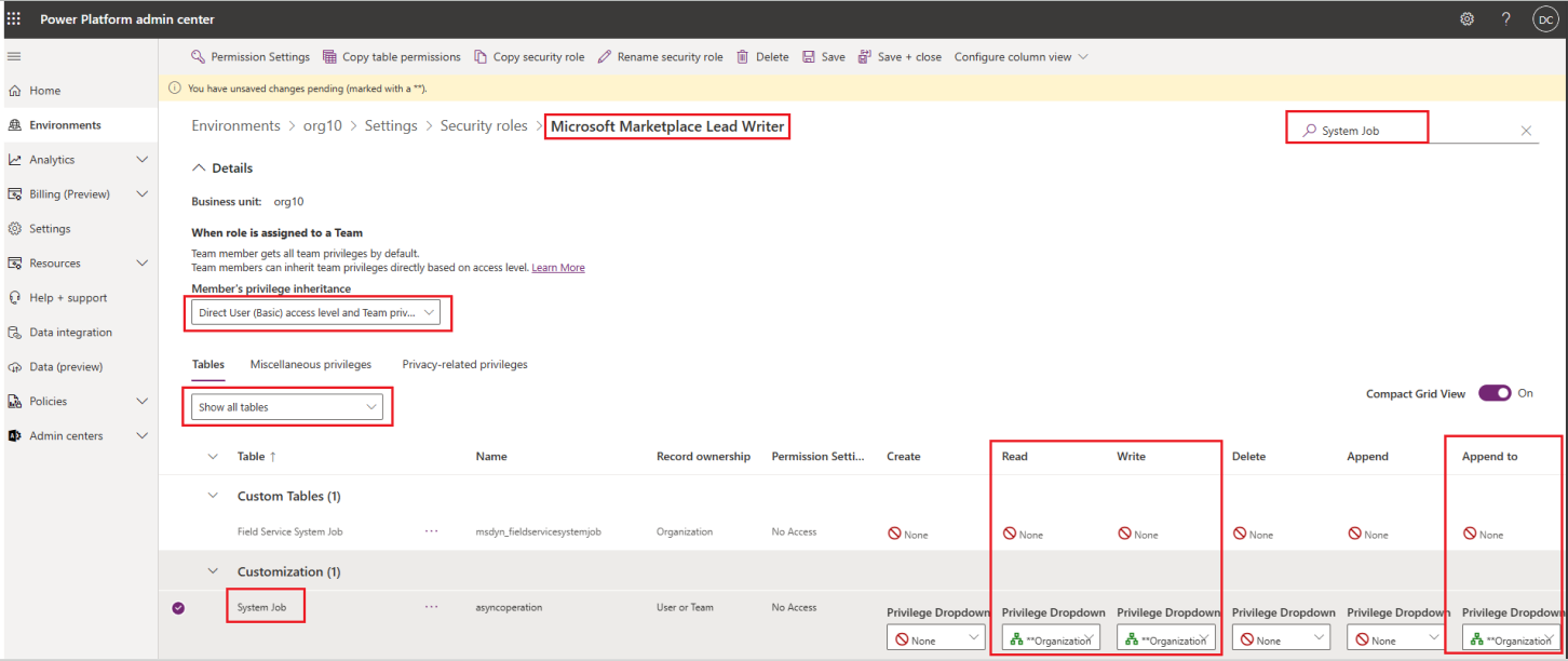 Cercare la tabella System Job sotto Personalizzazione e selezionare l'opzione a tendina del privilegio "Organizzazione" per ottenere le autorizzazioni di Lettura, Scrittura e Aggiungi a per quell'entità.