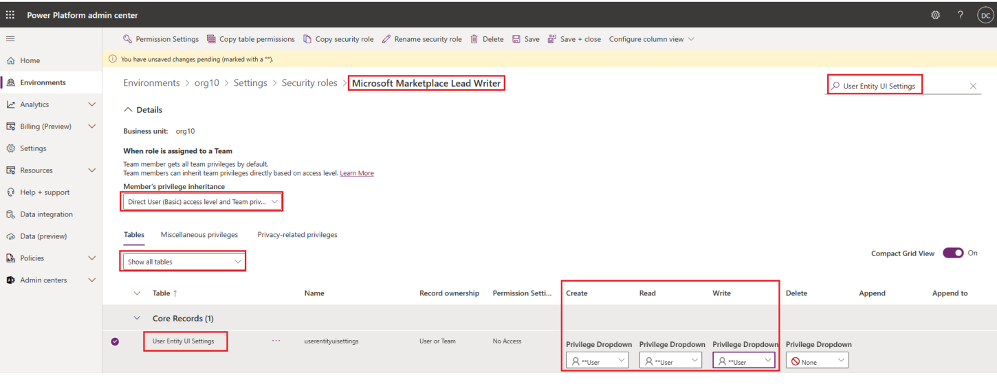 Cercare la tabella User Entity UI Settings in Record Principali e selezionare l'opzione a discesa dei privilegi "Utente" per le autorizzazioni di Creazione, Lettura e Scrittura per tale entità.