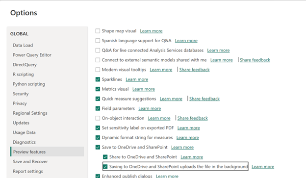 Per abilitare il caricamento in background, selezionare File > Opzioni e impostazioni > Opzioni > Funzionalità di anteprima, poi selezionare Il salvataggio su OneDrive e SharePoint carica il file nella casella di controllo in background. Dopo aver effettuato la selezione, è necessario riavviare Power BI Desktop.