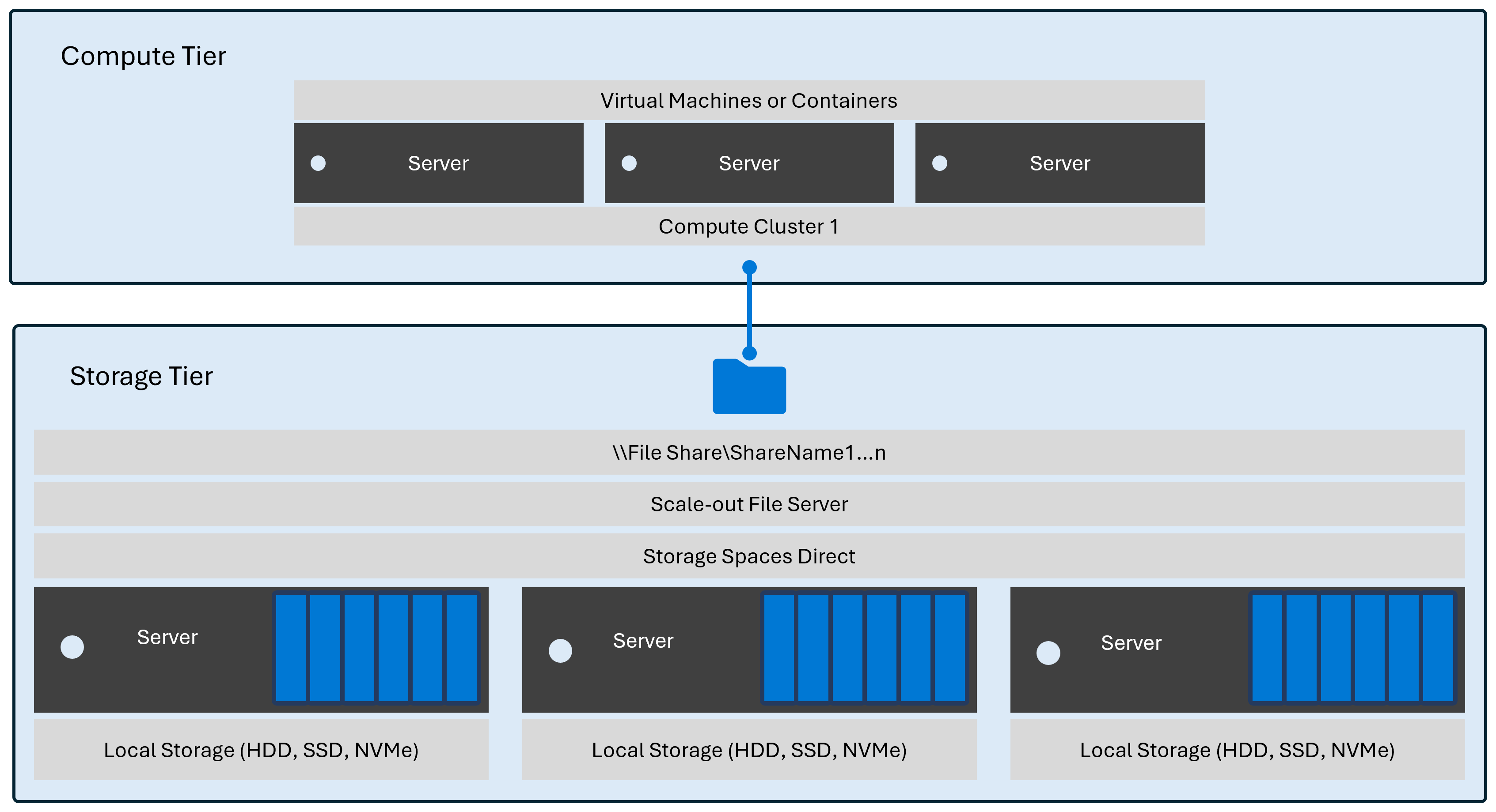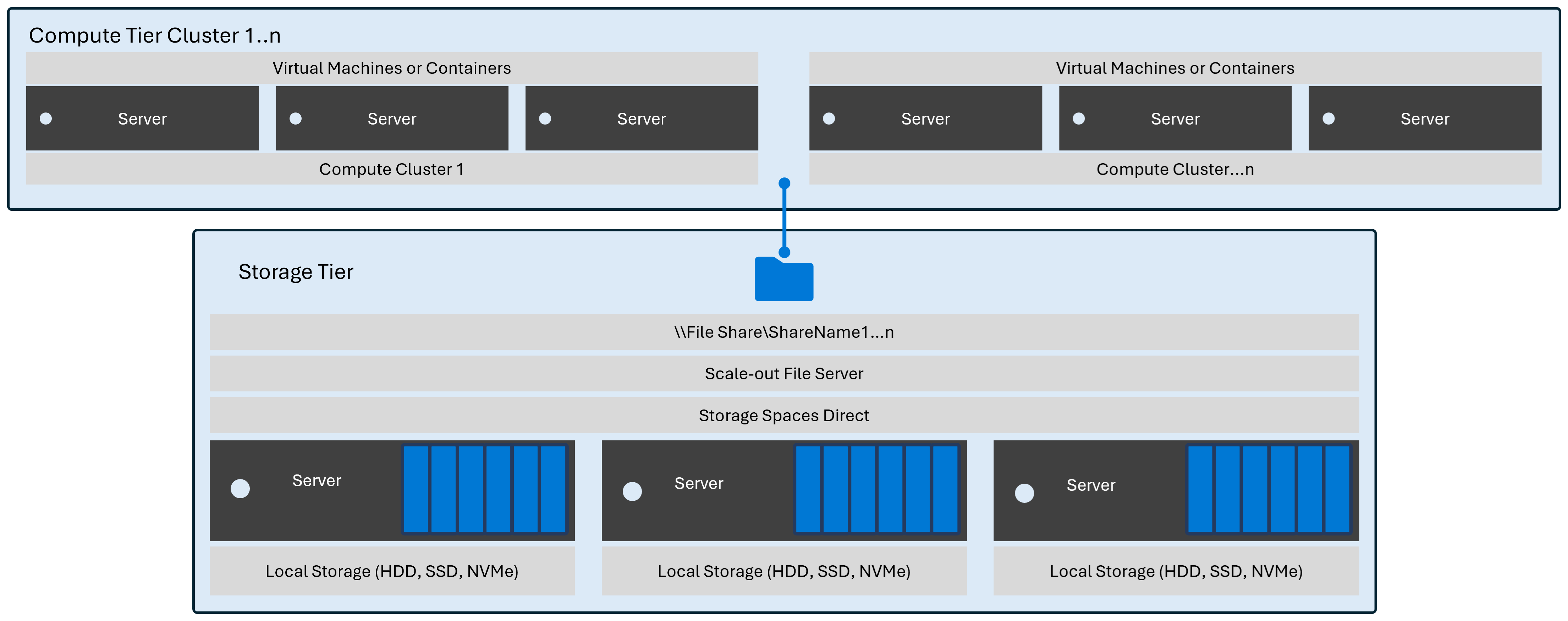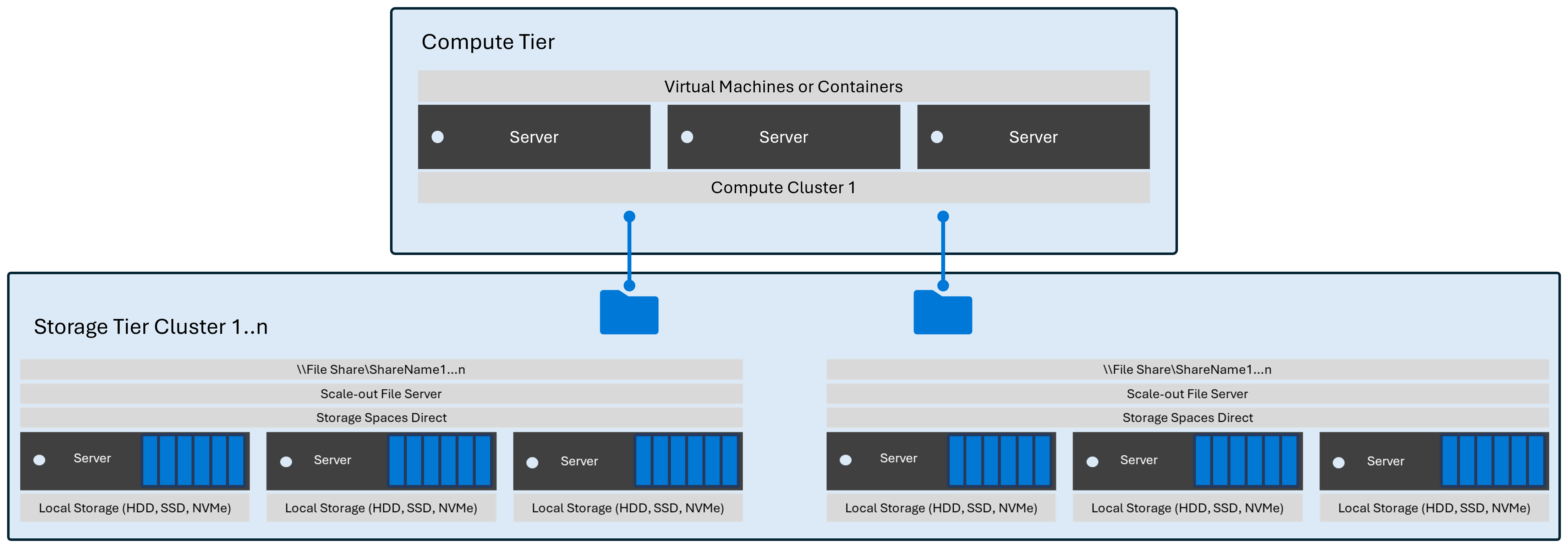 In questa configurazione si installano Hyper-V e Spazi di archiviazione diretta in cluster separati e si accede alla configurazione e all'archiviazione delle macchine virtuali in rete.