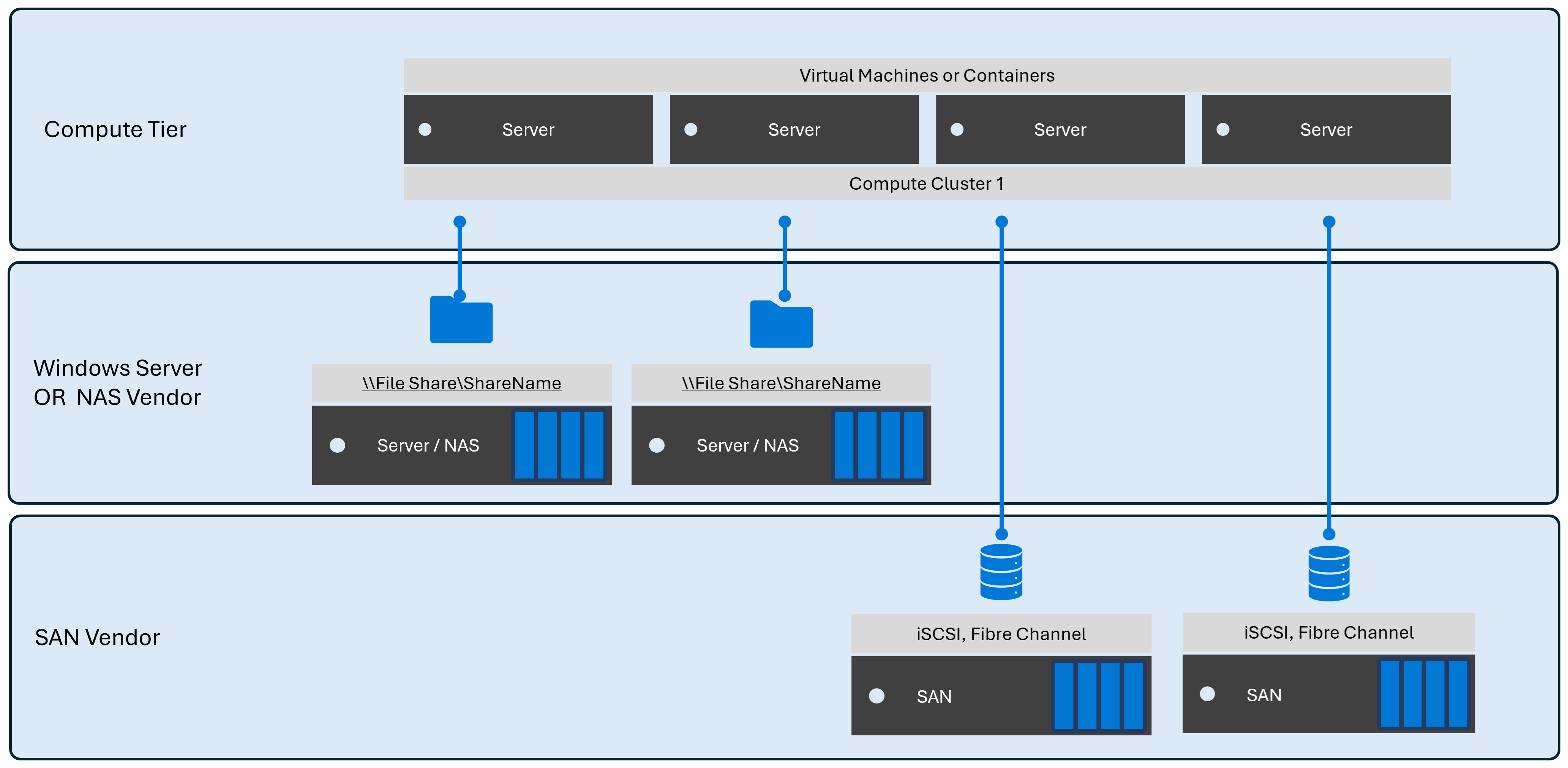 Con Windows Server in una configurazione disaggregata usando l'archiviazione SAN o NAS, è possibile installare Hyper-V in un cluster in cui le macchine virtuali accedono alla risorsa di archiviazione in rete.
