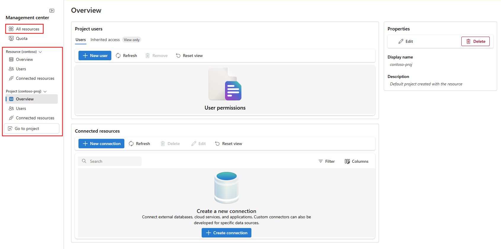 管理センターを使用して Foundry プロジェクトを作成および構成します。 [すべてのリソース] を使用して、アクセス権を持つすべての Foundry プロジェクトを表示するか、新しいプロジェクトを作成します。 左側のメニューの [プロジェクト ] セクションを使用して、Foundry リソースで個々の Foundry プロジェクトを管理および作成します。