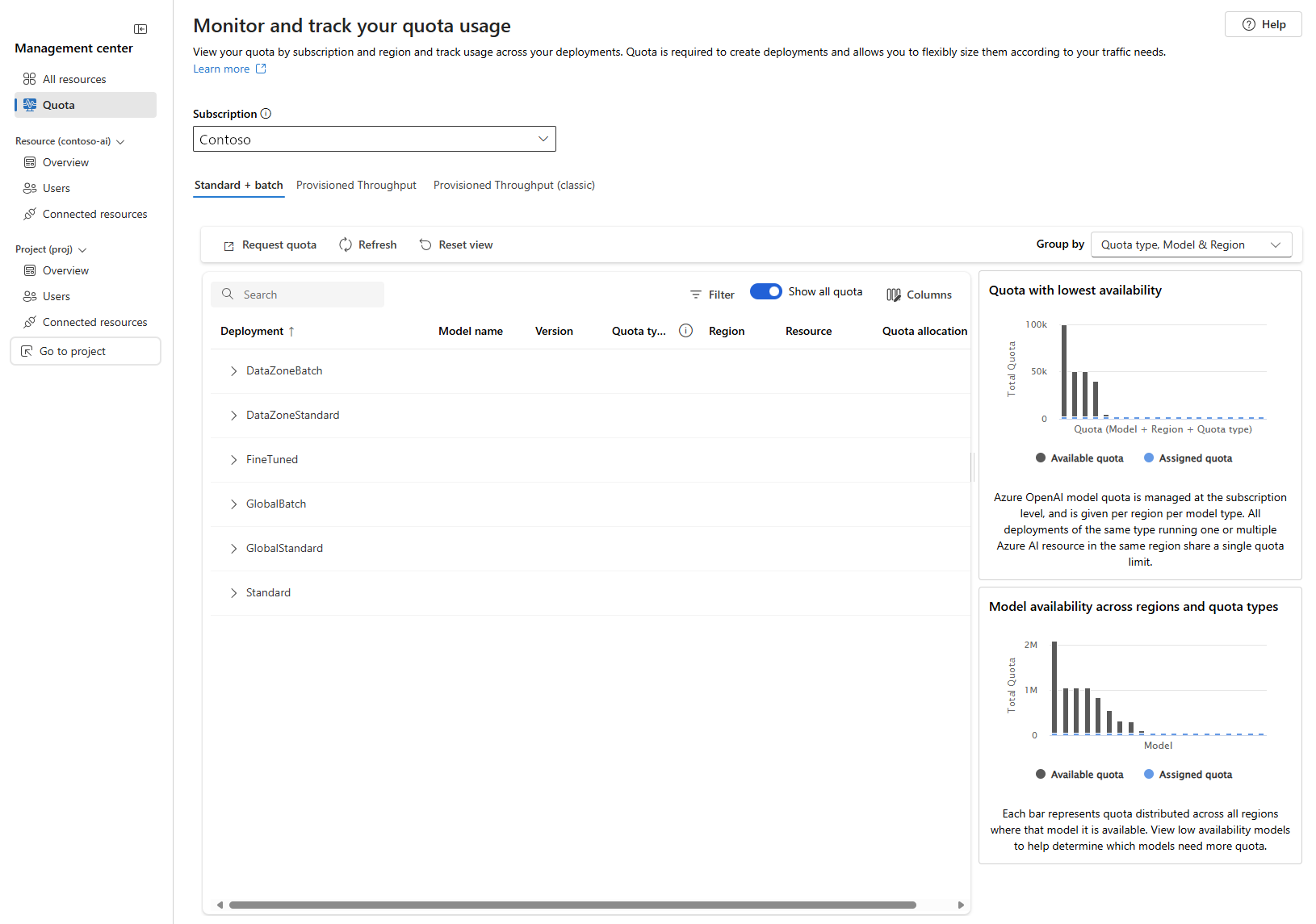 複数のプロジェクトと Azure サブスクリプション全体のクォータと使用状況メトリックを表示および管理します。 左側のメニューの [クォータ] リンクを使用して、クォータを表示および管理します。
