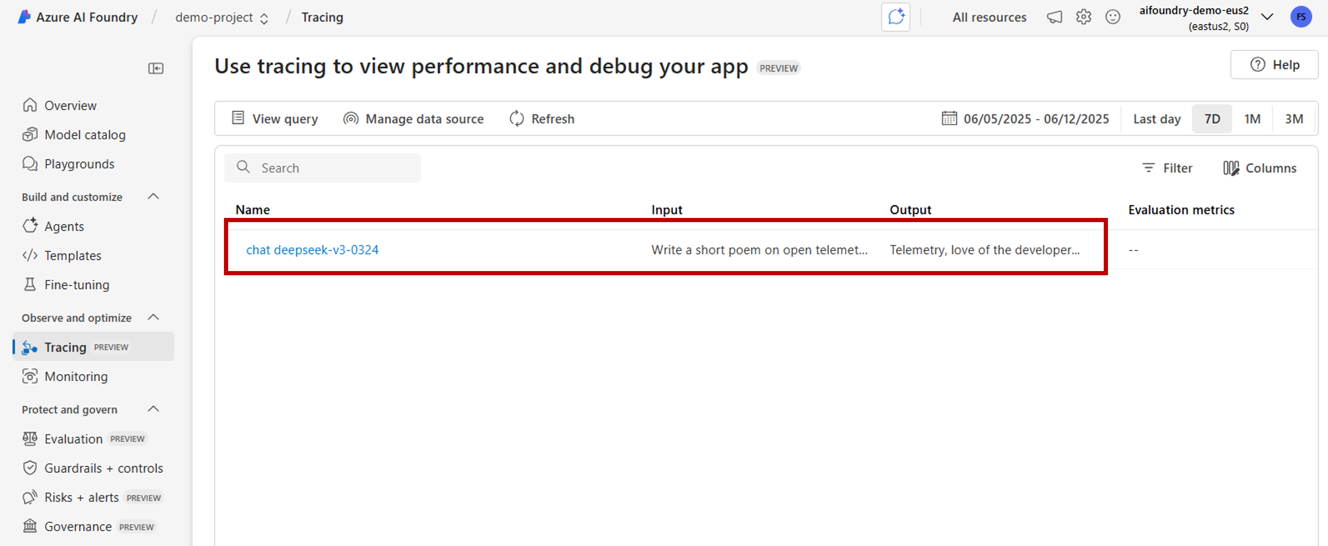 トレースが構成され、アプリケーションがインストルメント化されたら、Azure AI Foundry ポータルでトレース結果を表示できます。