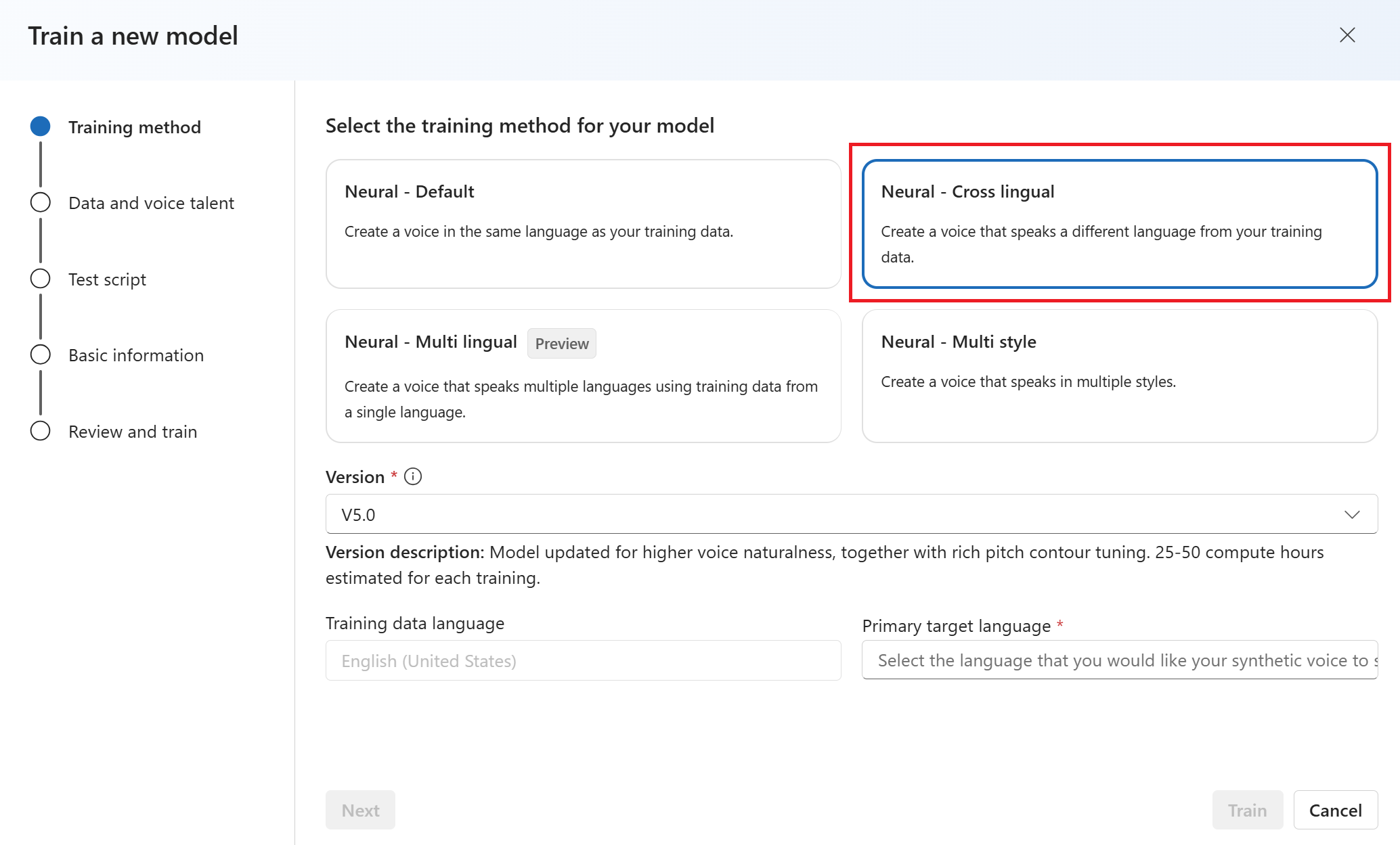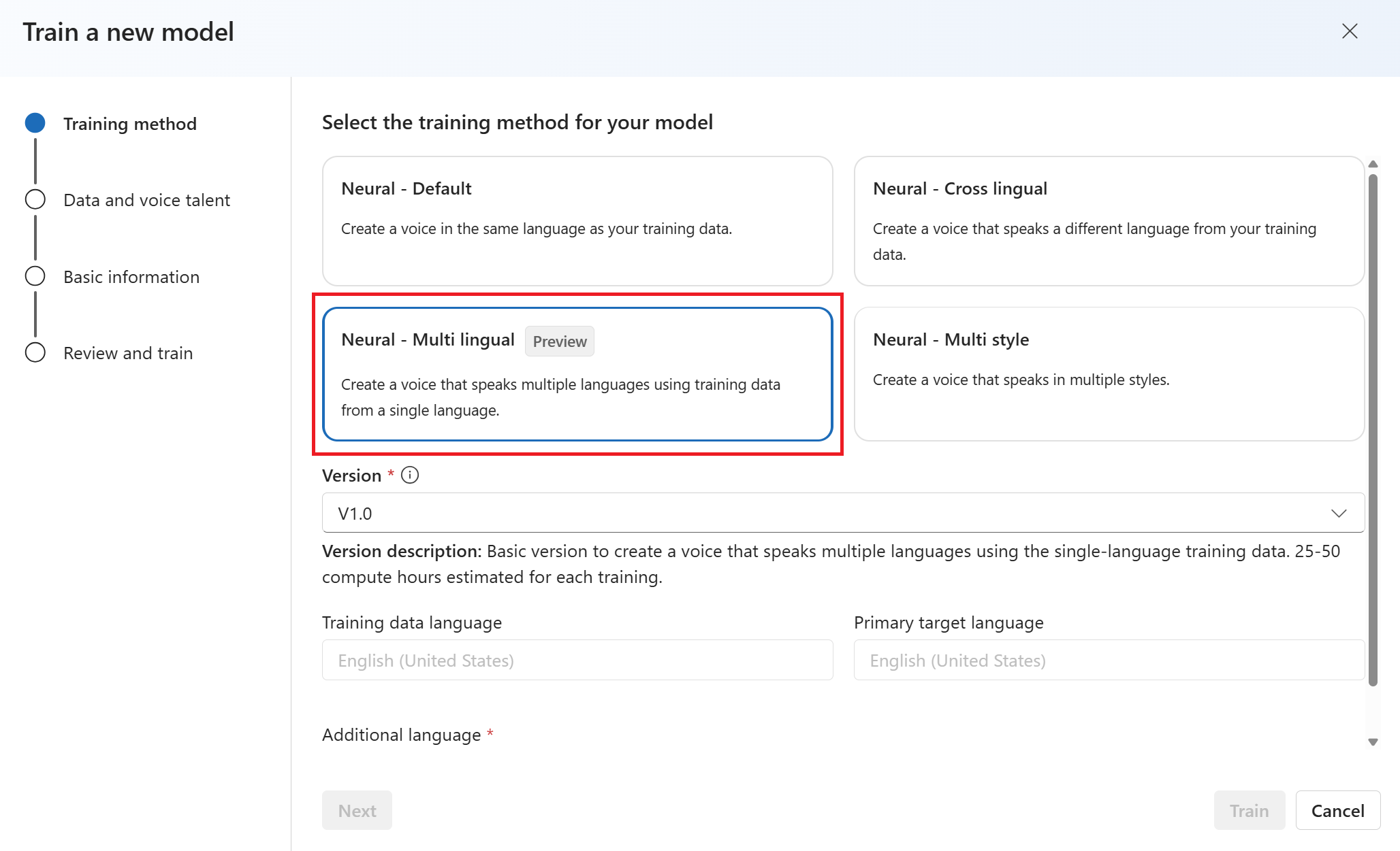ニューラル トレーニングの種類を選んだ場合は、複数の言語で話すように音声をトレーニングできます。