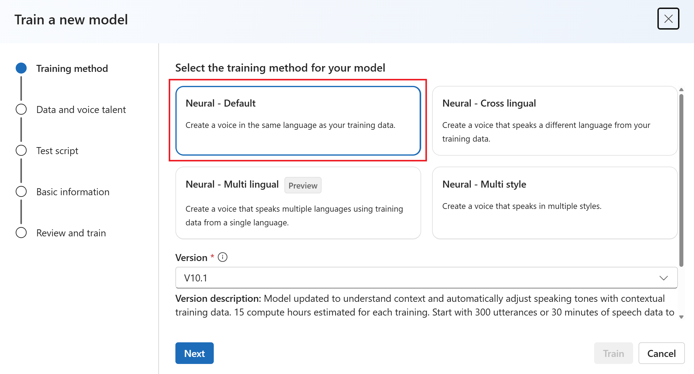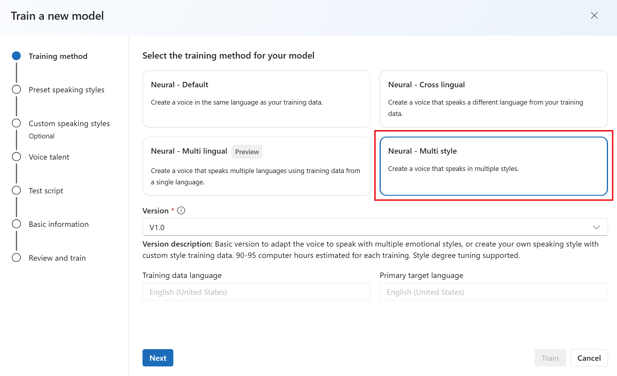 モデルのトレーニング方法として[ニューラル]を選択します。 別のトレーニング方法を使用するには、「 ニューラル - 多言語、 ニューラル - マルチ スタイル、 ニューラル - 多言語 (プレビュー)、ニュー ラル - HD 音声 (プレビュー)」を参照してください。