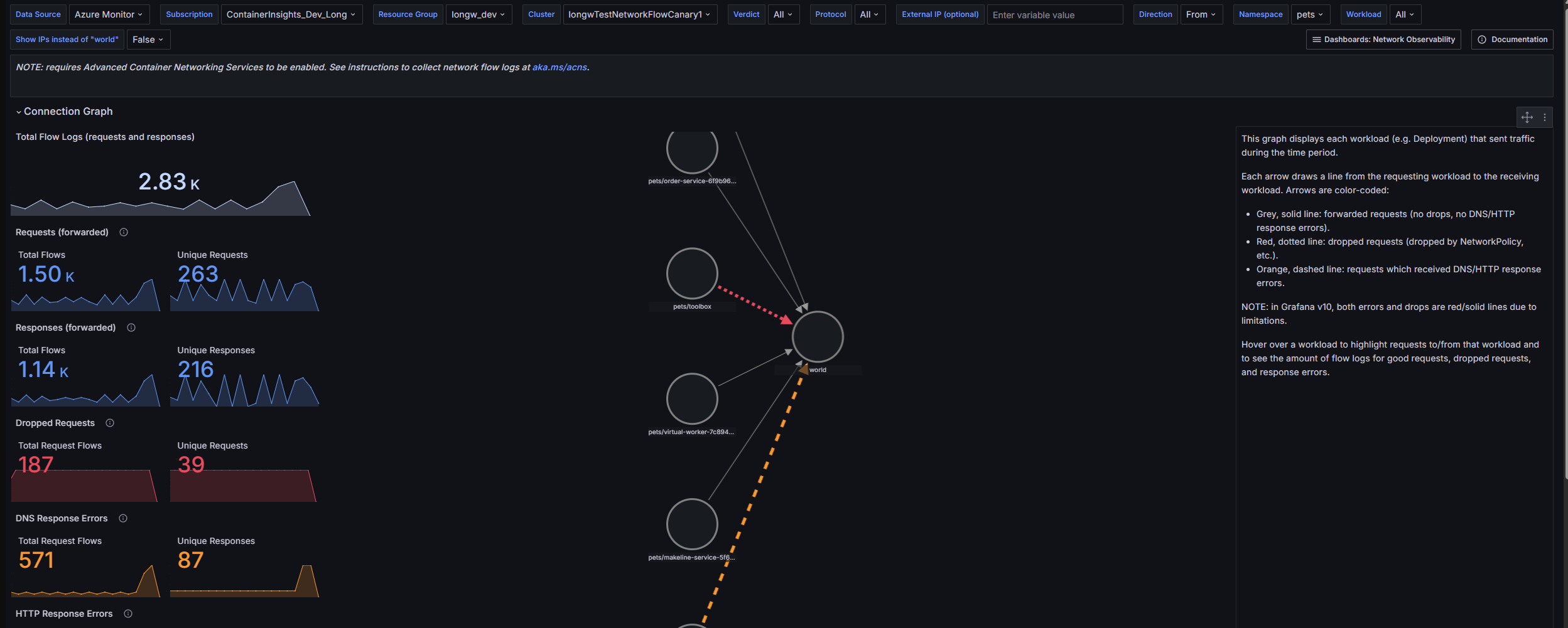 [Azure]>[分析情報]>[コンテナー]>[ネットワーク]>[フロー ログ] に移動します。 このダッシュボードには、ネットワーク要求、応答、ドロップ、エラーなど、相互に通信している AKS ワークロードが表示されます。 現時点では、プレビュー中の中間手順として、ユーザー ID を使用して Grafana ダッシュボードをインポートし、Azure portal でフロー ログ ダッシュボードを表示する必要があります。