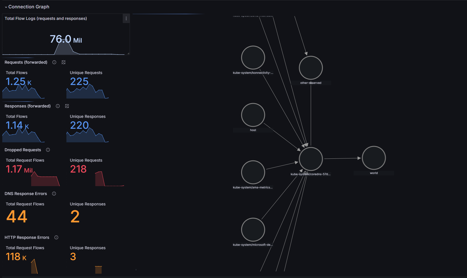 上位の名前空間、ワークロード、DNS エラー。 ネットワーク フロー ログの視覚化は、AKS クラスター内の通信を監視および分析するために不可欠です。 名前空間、ワークロード、ポートとクエリの使用状況に関する分析情報が提供されます。 傾向の特定、ボトルネックの検出、問題の診断に役立ちます。 重要なネットワーク アクティビティの検出、ドロップ要求の表示、プロトコルの分散の評価 (TCP と UDP など)。 ダッシュボードのこの概要セクションでは、異常なトラフィック パターンを検出して表示することで、クラスターの正常性、リソースの最適化、セキュリティをサポートします。