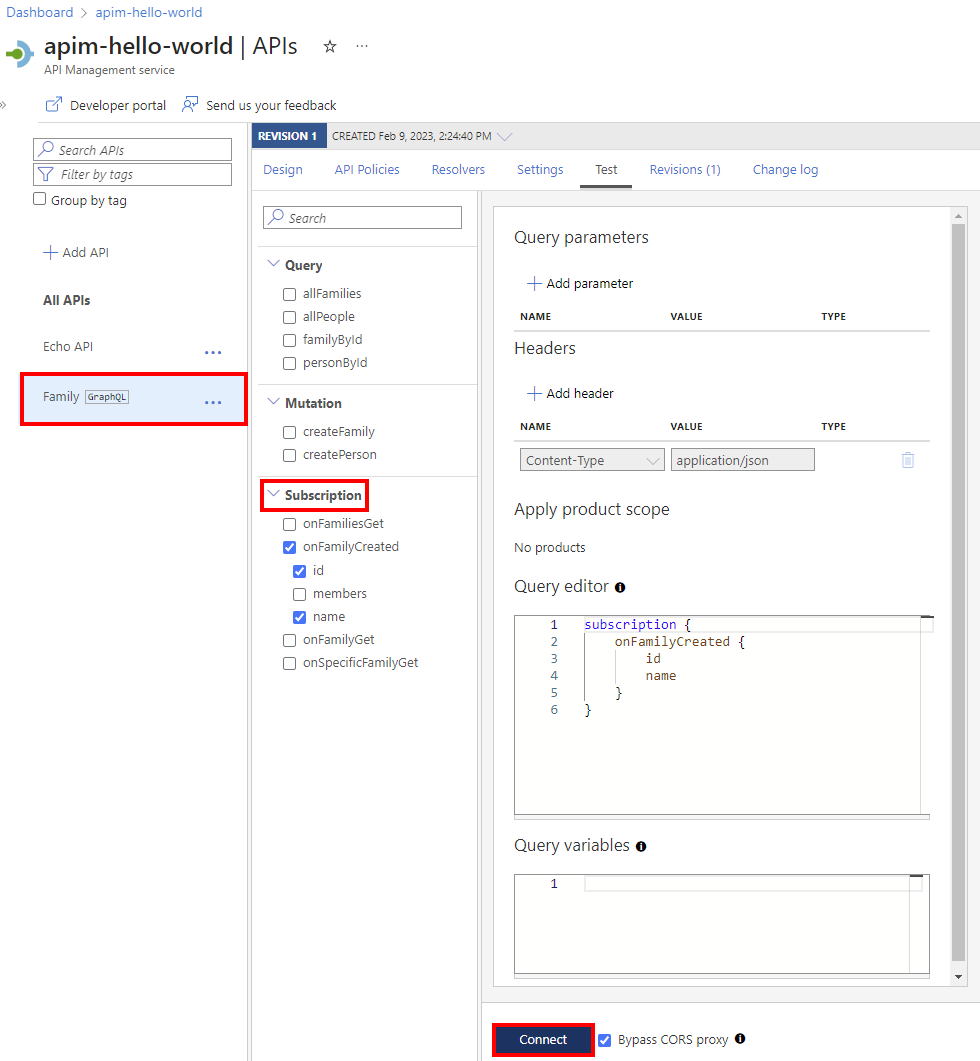 クエリ エディターでサブスクリプション クエリを設定し、[接続] を選択してバックエンド サービスへの WebSocket 接続を確立します。
