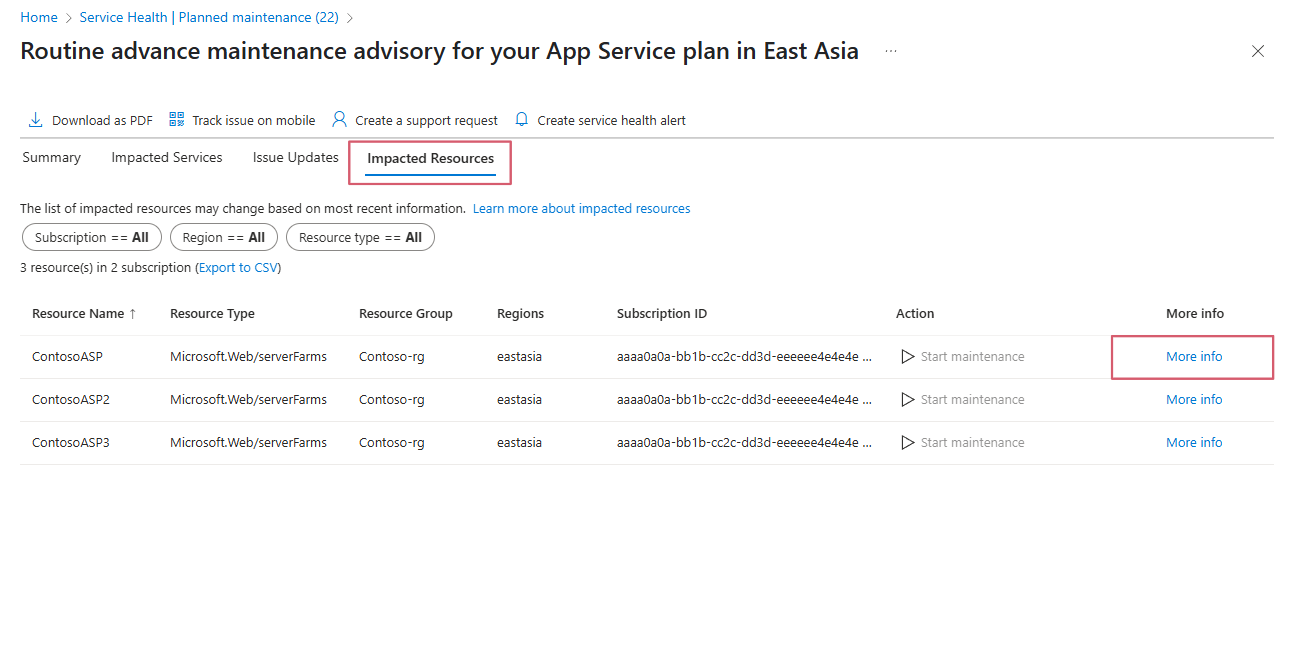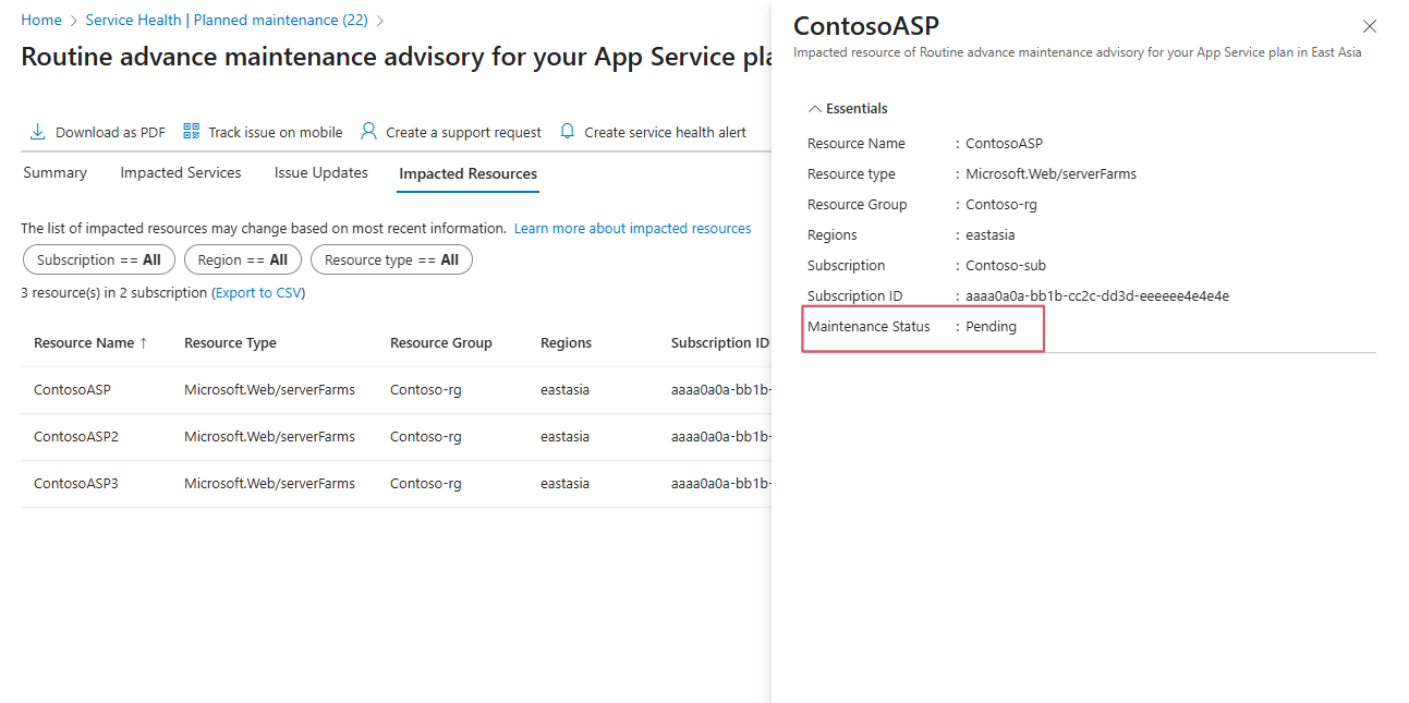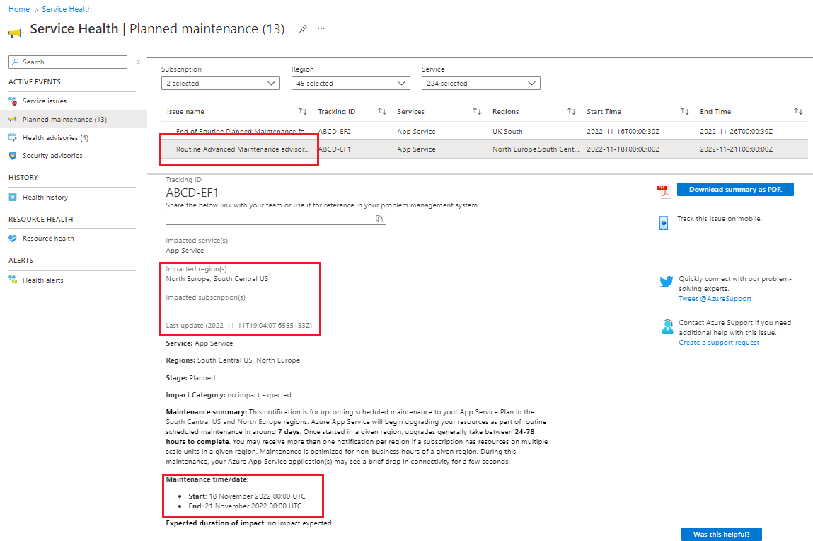 多くの場合、お客様には、異なる時間にアップグレードされる複数のアプリケーションがあります。 それぞれについて個別に通知が送られるのを避けるため、複数のリソースを対象とする 1 つの通知が送られます。 通知は、メンテナンス期間の最初と全体を通じて送られます。 時間枠が長い場合、同じロールアウトに対して複数のリマインダーを受け取る可能性があるため、再起動、中断、またはその他の問題をより簡単に関連付けることができます。