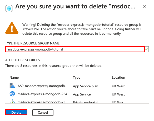 - [リソース グループ] で、msdocs-expressjs-mongodb-tutorial を選択します。