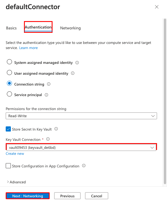 作成ウィザードにより、接続文字列がアプリ設定として既に自動的に生成されています。 ただし、セキュリティのベスト プラクティスは、App Service からシークレットを完全に排除することです。 シークレットをキー コンテナーに移動し、サービス コネクタを利用してアプリ設定を Key Vault 参照に変更します。