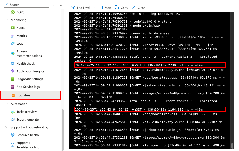 AZD の出力で、App Service ログをストリーミングするためのリンクを見つけ、ブラウザーでそこに移動します。 このリンクは、AZD の出力では次のようになります。