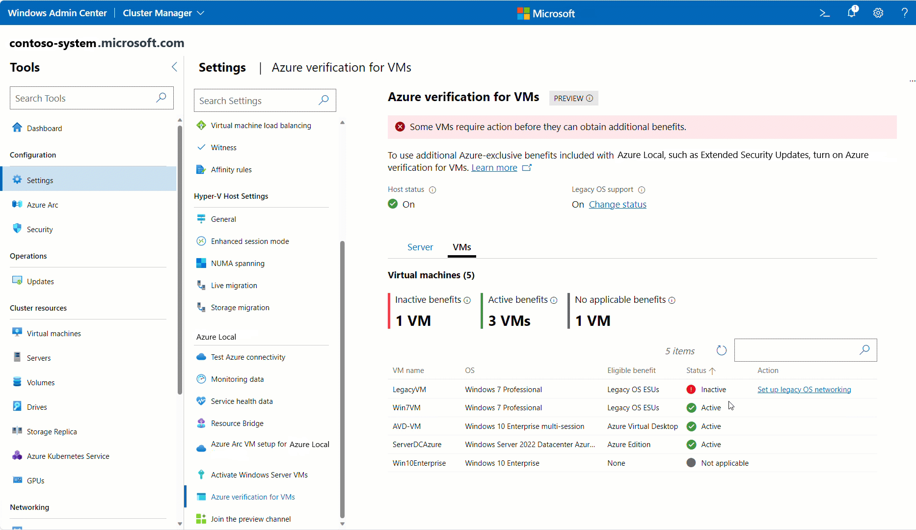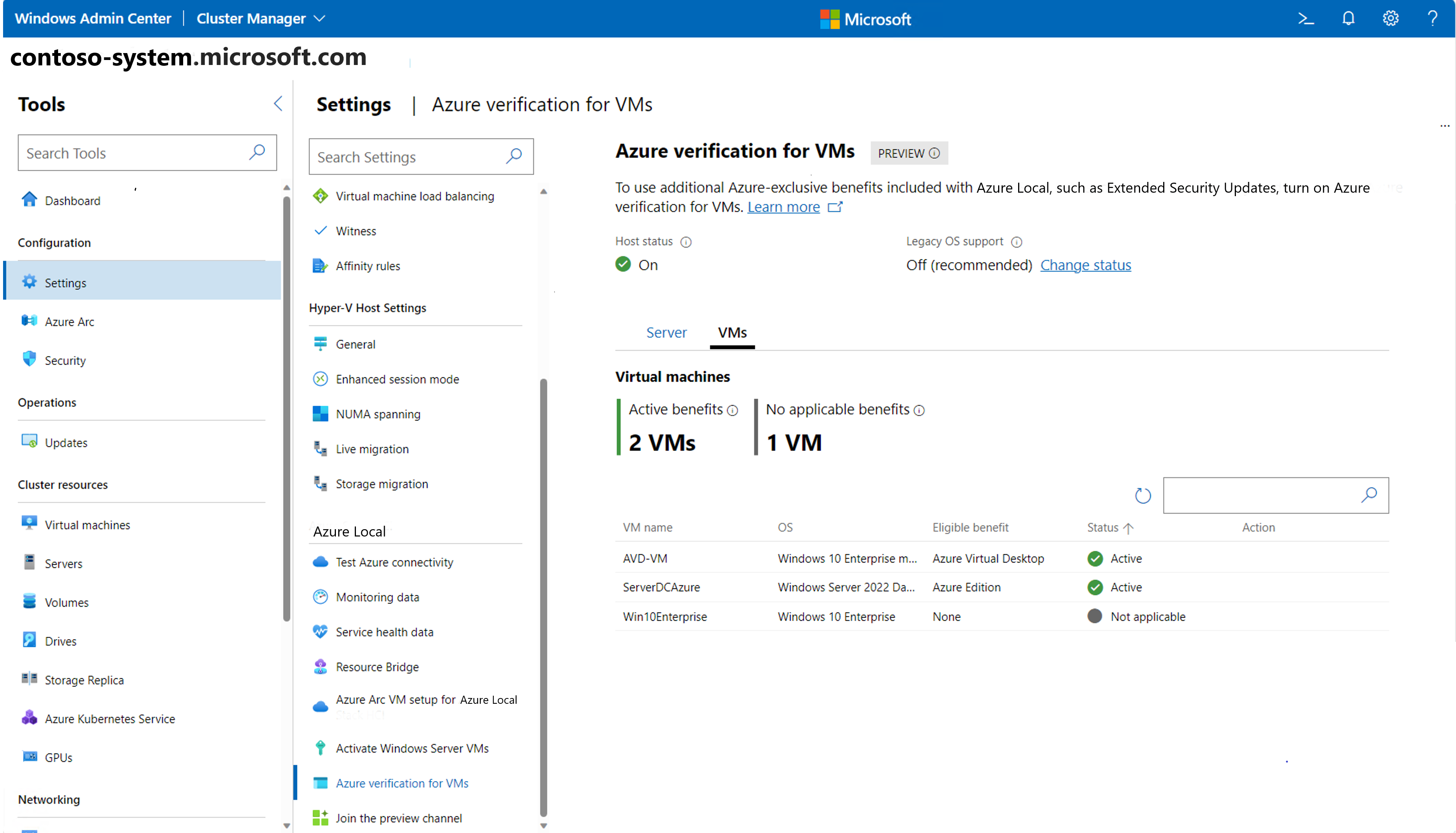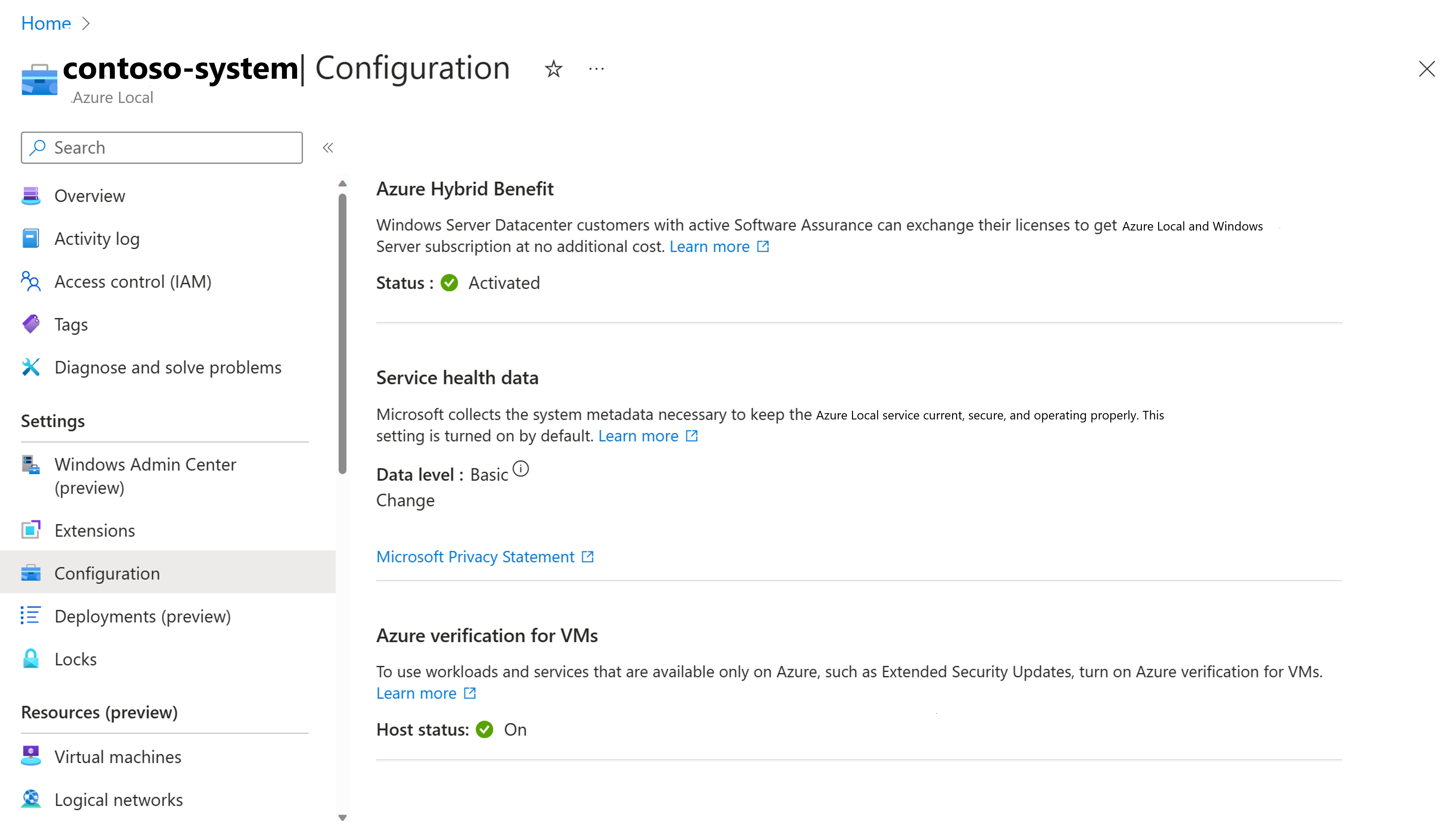 以前に Azure Benefits on Azure Local をワークロード用に設定 システムをアップグレードした場合、Azure Local にアップグレードするときに何もする必要はありません。 アップグレードすると、この機能は有効なままになり、レガシ OS のサポートも有効になります。 ただし、VM Bus を介して VM 間通信を行う方法を改善する場合は、必要な ホストの前提条件 と VM の前提条件確認してください。