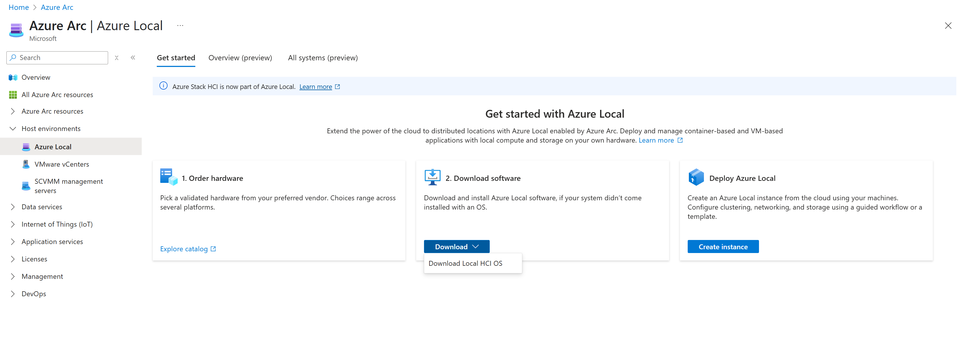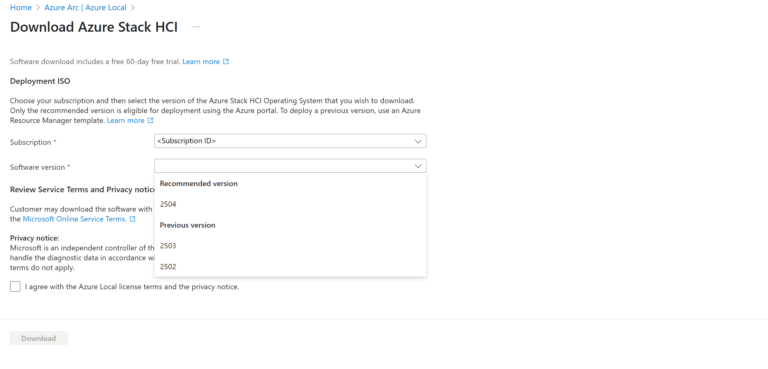 Azure Local をデプロイする最初の手順は、Azure portal から OS をダウンロードすることです。 ソフトウェアのダウンロードには、60 日間の無料試用版が含まれています。 ただし、優先する Microsoft ハードウェア パートナーを通じて Azure ローカル カタログ から統合システム ソリューション ハードウェアを購入した場合は、OS がプレインストールされている必要があります。 その場合は、この手順をスキップし、「マシンの登録」に進 み、Azure ローカル デプロイのアクセス許可を割り当てることができます。