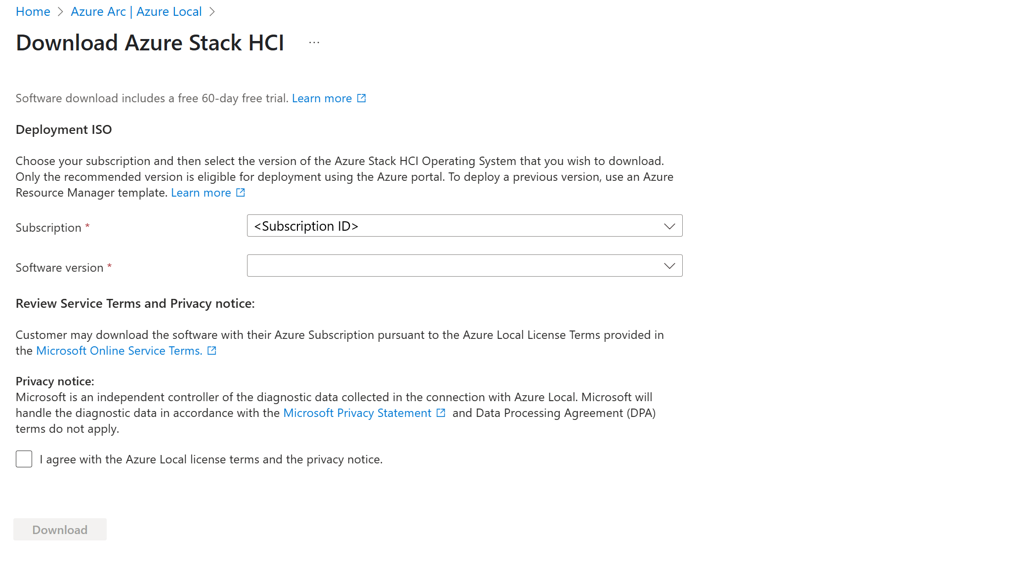 [ Azure ローカル ライセンス条項とプライバシーに関する通知に同意 する] を選択し、[ ダウンロード] を選択します。