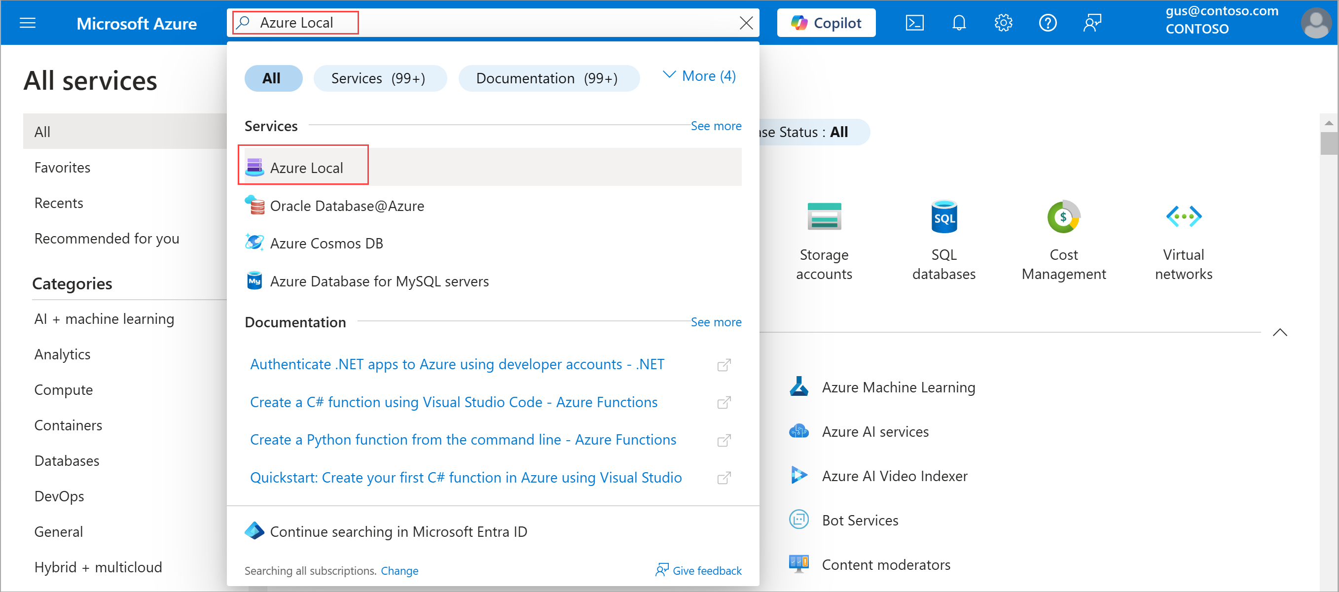 上部の Azure portal 検索バーに「 Azure Local」と入力します。 入力すると、ポータルは入力に基づいて関連するリソースとサービスの提案を開始します。 [サービス] カテゴリで [Azure Local] を選択します。