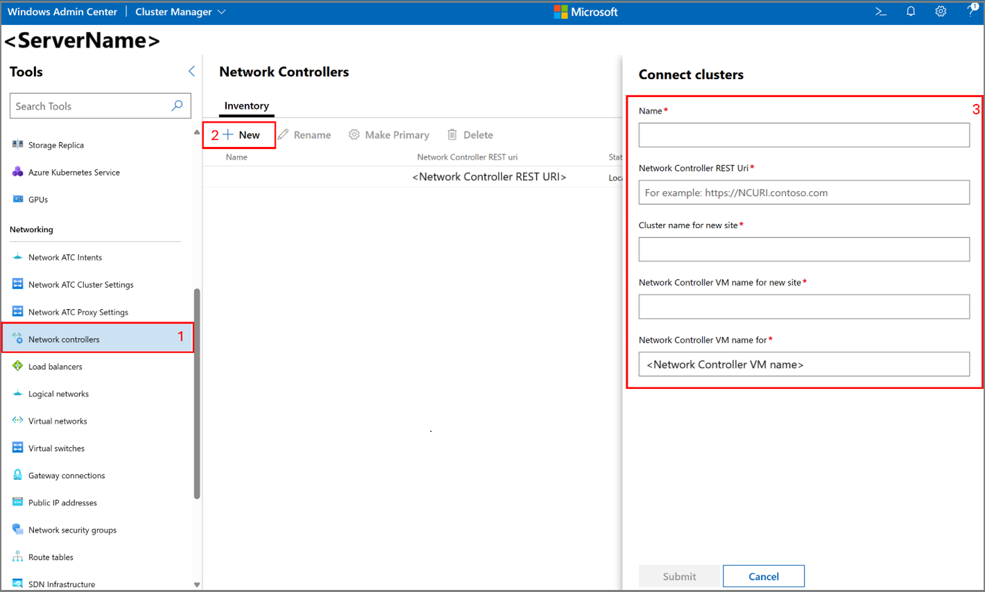 Windows Admin Center で、プライマリ サイトのクラスターに接続して、サイト間のピアリングを開始します。 [ツール]で、[ネットワーク] セクションまで下にスクロールし、[ネットワーク コントローラー] を選択します。