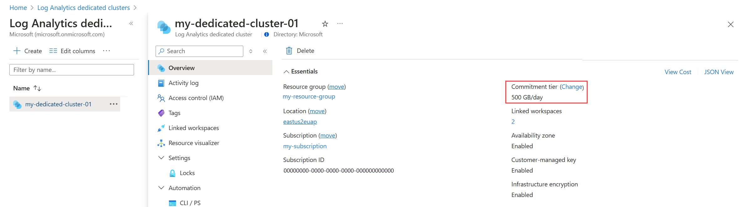 Azure portal の Log Analytics 専用クラスター メニューからクラスターを選択し、[コミットメント レベル] の横にある [変更] をクリック