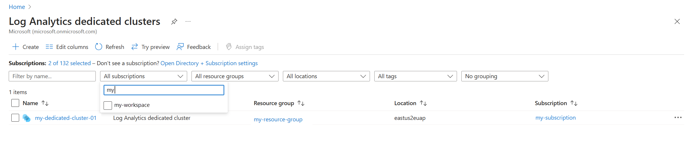 Azure portal の Log Analytics 専用クラスター メニューから、[サブスクリプション] フィルターを選択します。
