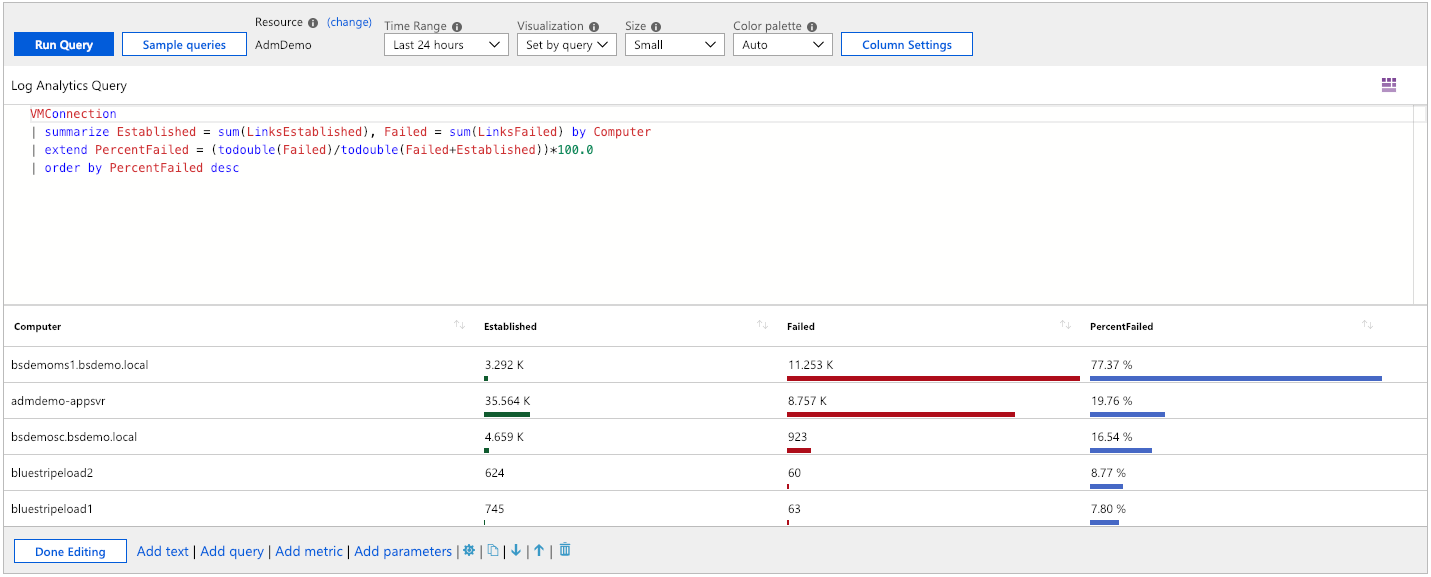 | summarize Sent = sum(BytesSent), Received = sum(BytesReceived) by bin(TimeGenerated, {TimeRange:grain})