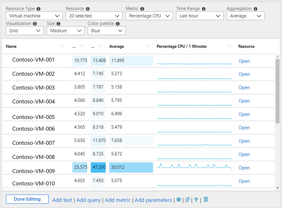- CPU 使用率、ディスク領域、メモリ、ネットワークの依存関係など、目的のメトリックが事前にわかっていないときに、仮想マシン (VM) の使用状況を調べます。 他の使用状況分析ツールとは異なり、ワークブックを使用すると、複数の種類の視覚化や分析を結合できるため、この種のフリーフォーム探求に適しています。