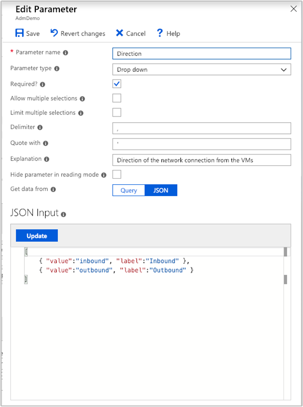 ドロップダウンはログ クエリまたは JSON によって設定されます。 クエリから 1 つの列が返される場合、その列の値はドロップダウン コントロールの値とラベルの両方になります。 クエリから 2 つの列が返される場合は、最初の列が値になり、2 番目の列がドロップダウンに表示されるラベルになります。 クエリから 3 つの列が返される場合は、3 番目の列を使用して、そのドロップダウンの既定の選択が示されます。 この列には任意の型を指定できますが、最も簡単なのはブール型または数値型を使用することです。この場合、0 が false、1 が true です。
